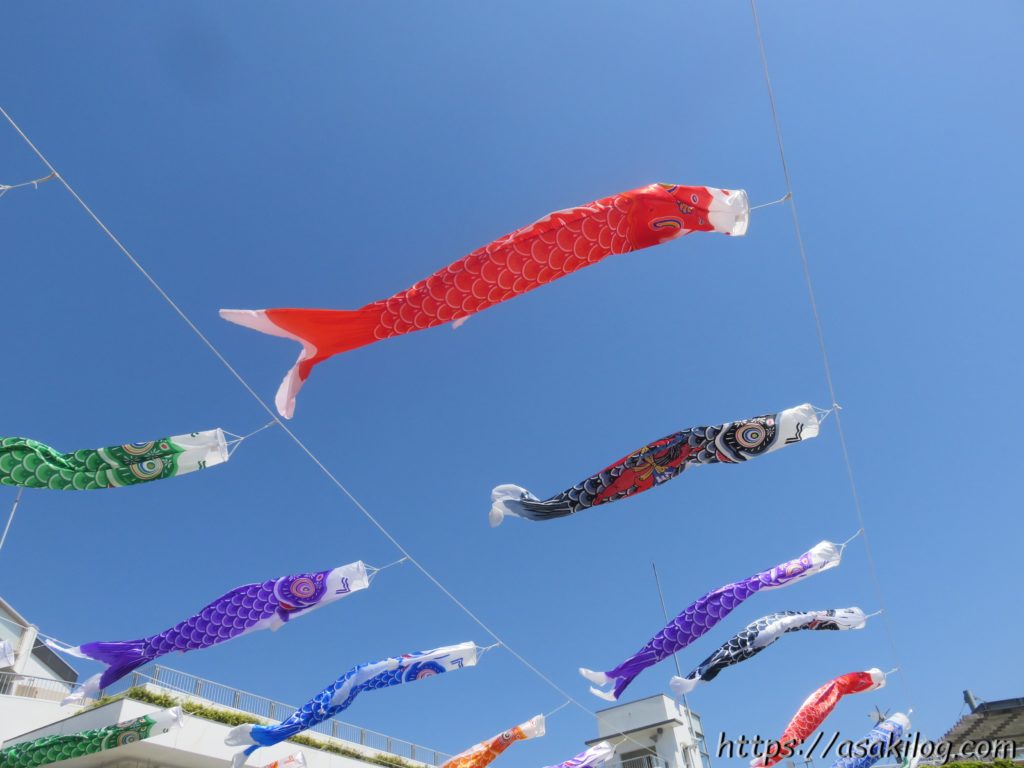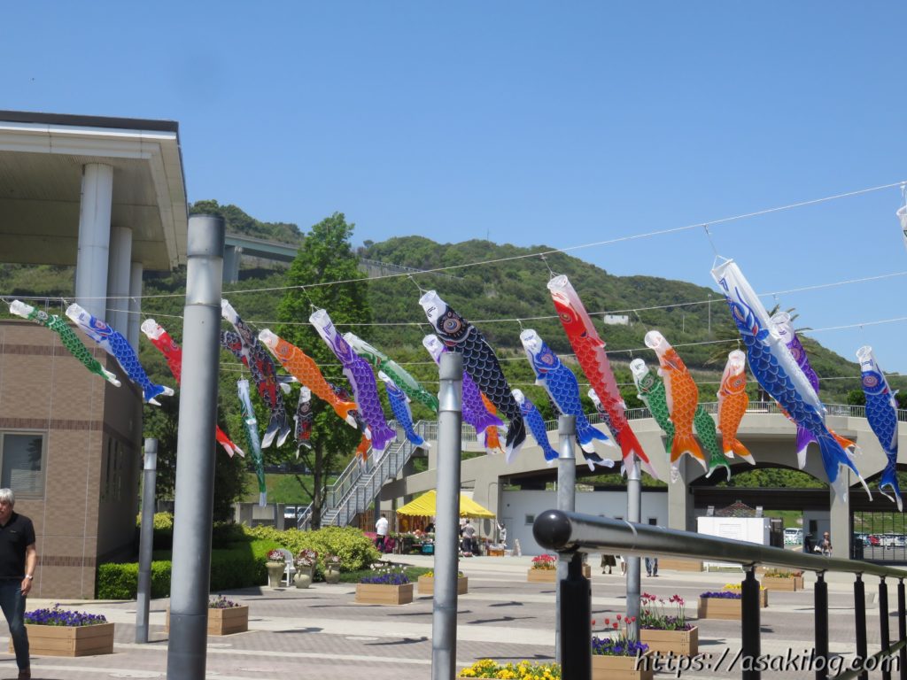 ランチのあとは、トイレタイム。近くのパークセンターに行くと、鯉のぼりが気持ちよさそうに泳いでいました。