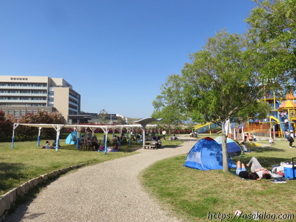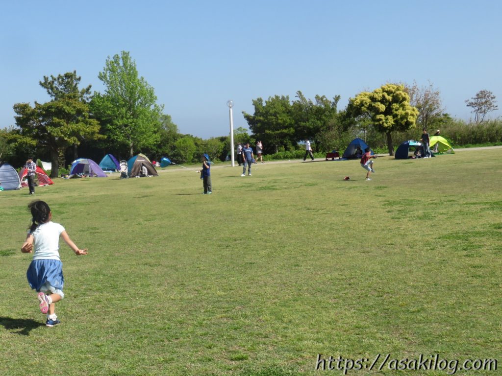 最後に、娘さんお待ちかね!芝生広場の大型複合遊具:夢っこランドへ!まずは芝生広場を通ります。