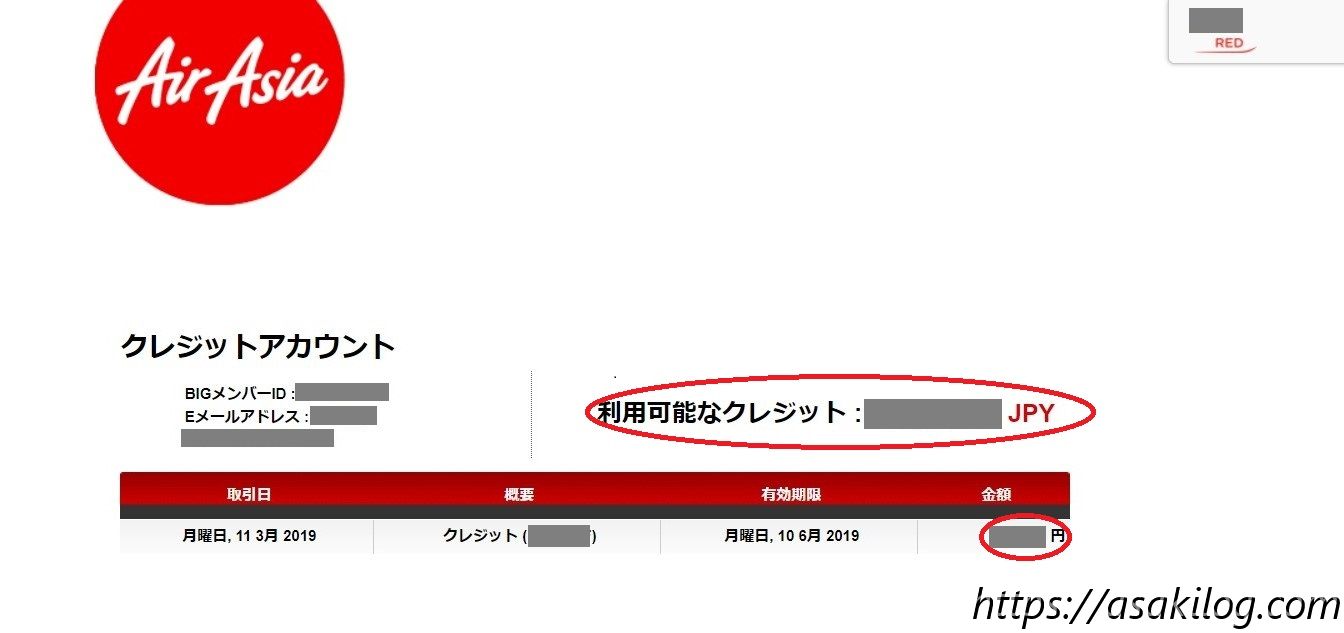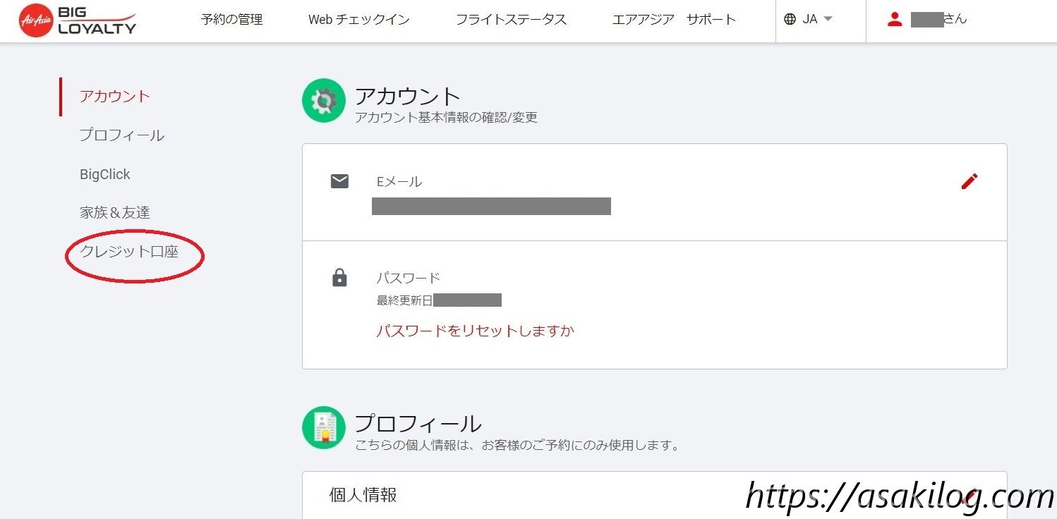 エアアジアのクレジットアカウントは、エアアジアのログイン後画面で確認できます。