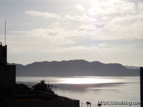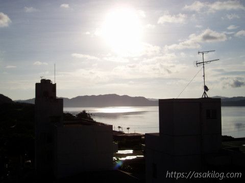 コテージに宿泊して、翌朝、奄美大島の砂浜をお散歩したときの景色です。海面に太陽が反射してキラキラ眩しかった。