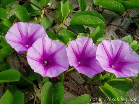 この花の名前は、グンバイヒルガオ(だと思います)。葉っぱの形が、軍配の形に似ていることから、命名されたとか?!