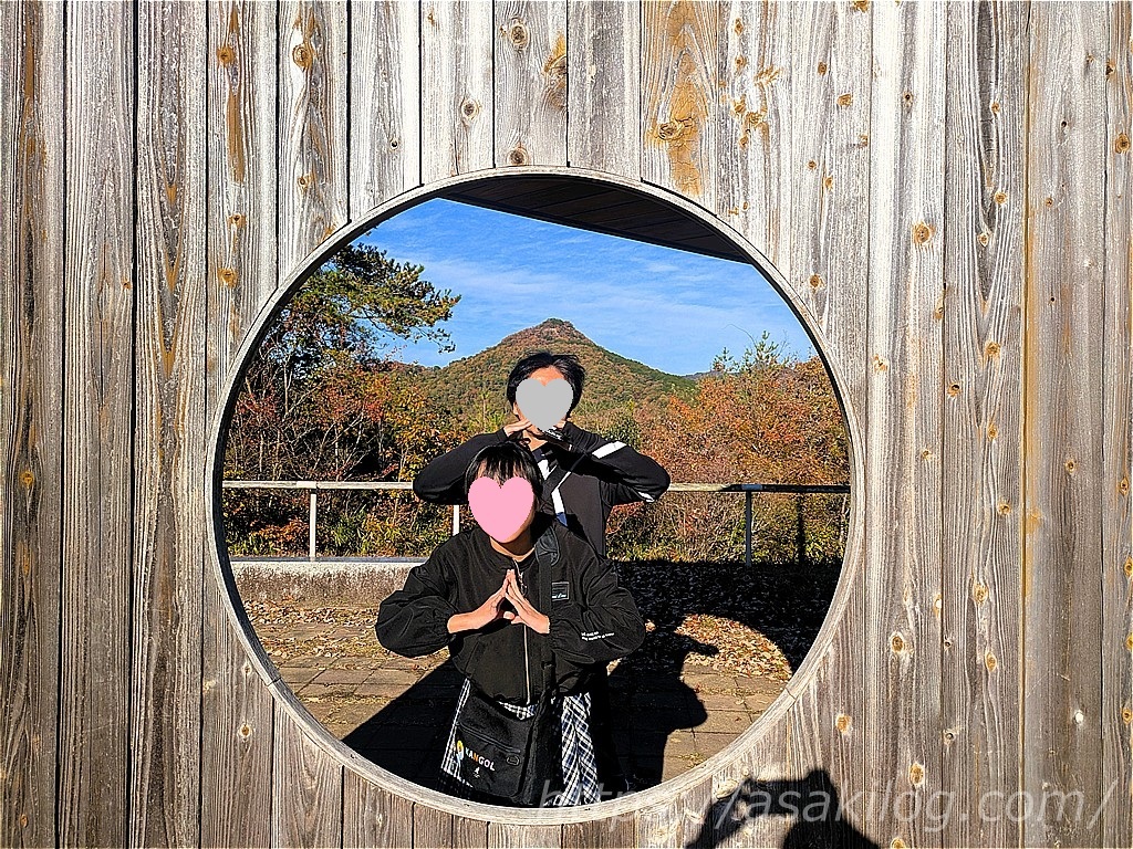 公園内には、こちらの景観フレーム?から有馬富士を覗き込めるスポットも。早速、夫君と娘がはしゃぎながら山ポーズで記念撮影!・・・このフレーム、こうやって撮るためのもので合ってますよね?