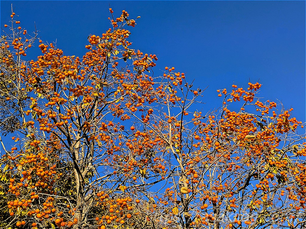有馬富士公園内の「かやぶき民家」は、とても懐かしい景観。ここに吊るした干し柿は、近くにたくさん実がついていた柿の木のものでしょうか?