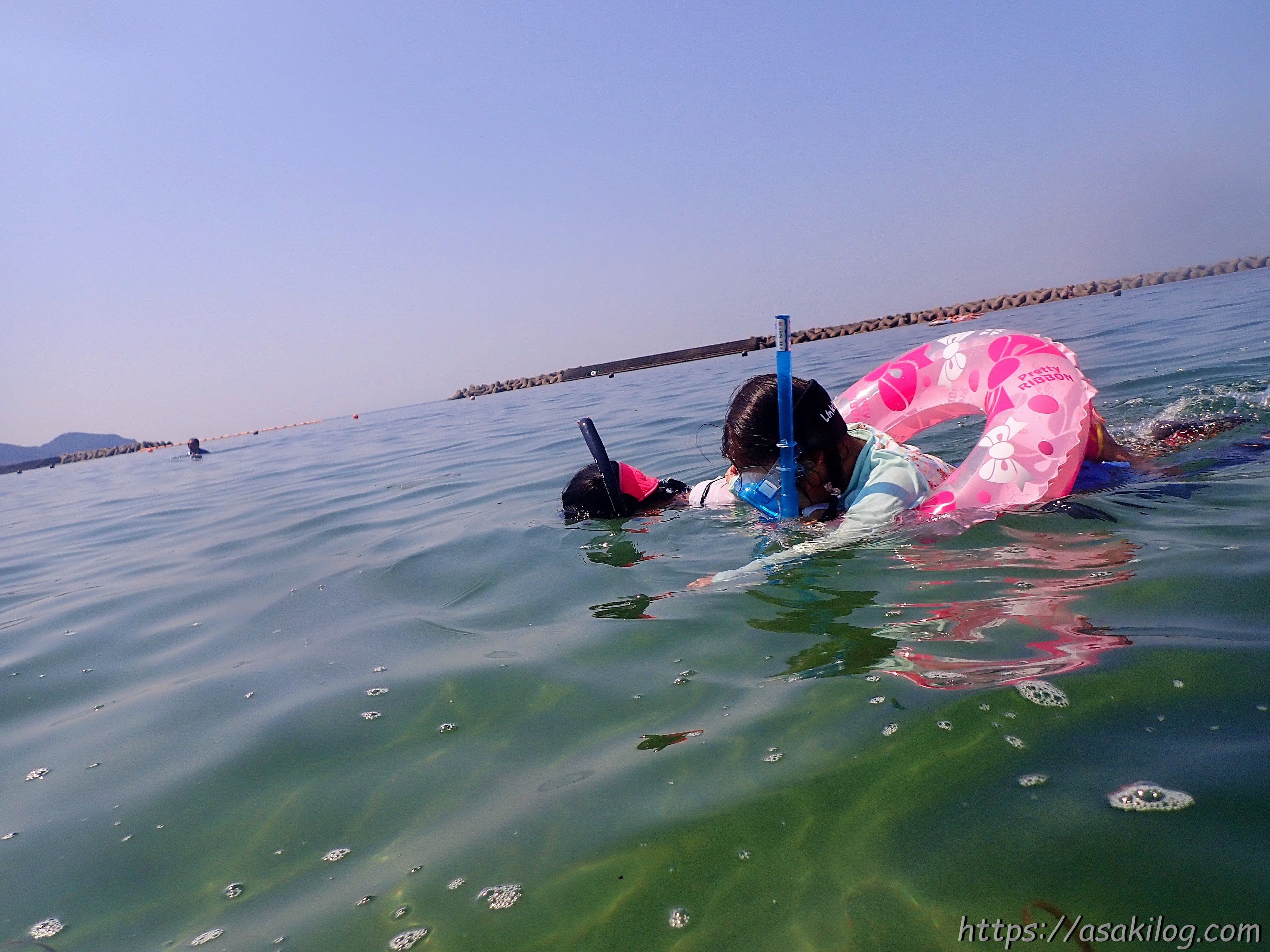 今回、娘にシュノーケリングの練習もさせてみました。最初は、ライフジャケット+マスク+スノーケルで練習していたのですが、波に揺られて海水を飲んでしまい「しょっぱい!!」とお怒りの様子。