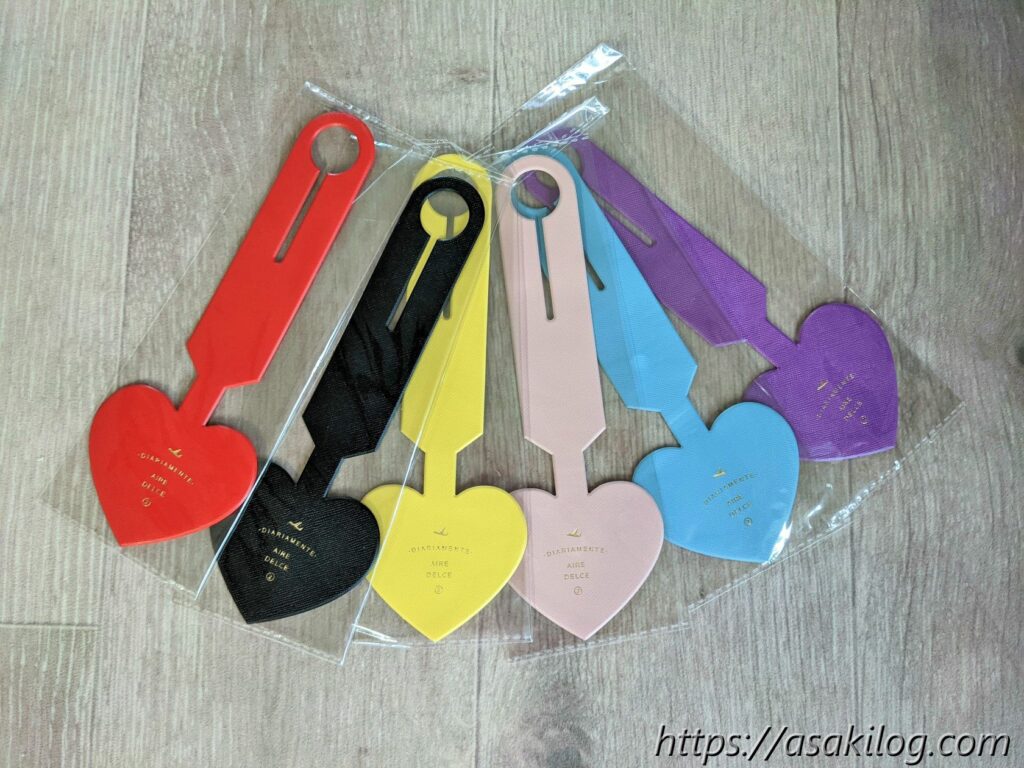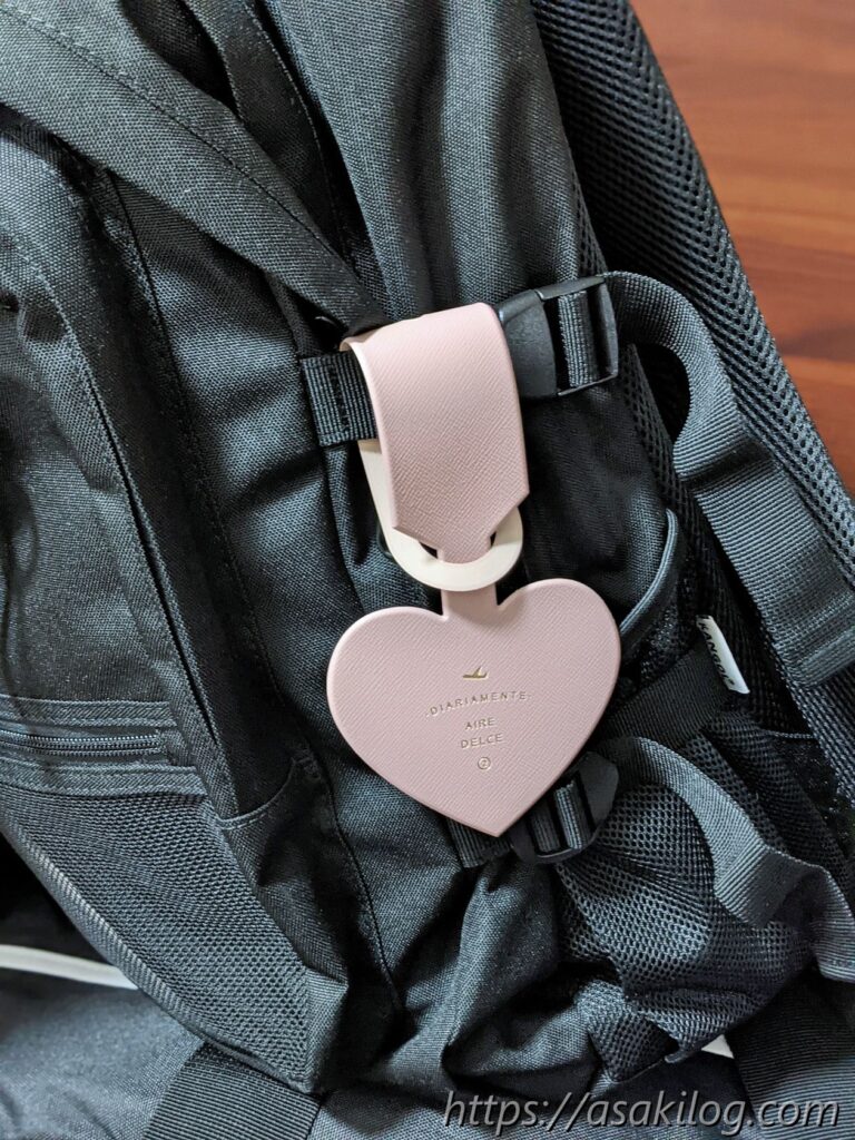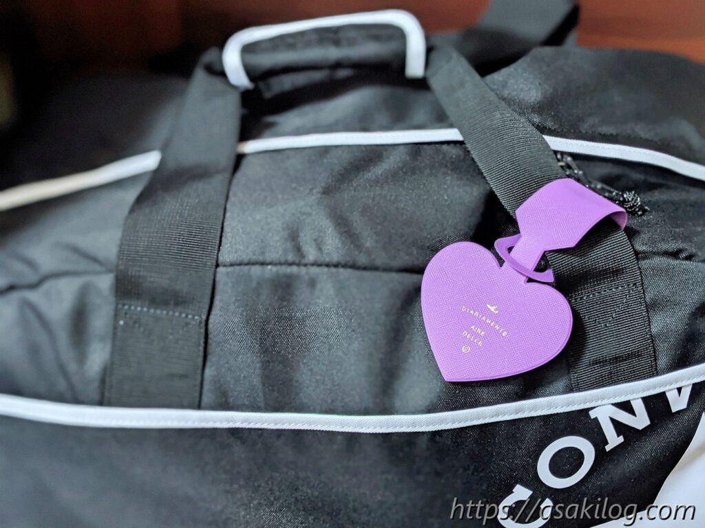 カラフルな女子らしいボストンバッグもたくさん売ってたけど、あえて長く使うために黒のボストンバッグを選んだのですが、お友達のバッグと間違えそう・・・。少しでも可愛くしてあげたくて、amazonでハート形のネームタグを購入しました。