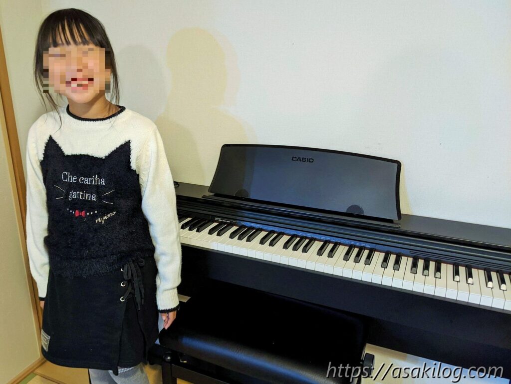 写真は、電子ピアノに満足げな娘。顔にモザイク入れてますが、めっちゃ笑顔なんです。買ってあげて良かった!