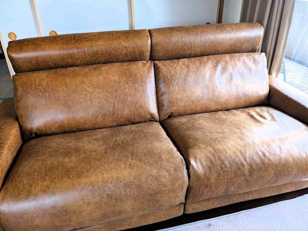 そこで選び直したのが、こちらの「関家具 ハーデス 3人掛けリクライナーソファ」です。我が家で初の電動リクライニングソファー、試しに購入してみるか悩んだのですが、買って正解! ゴロンとして足を伸ばせるのがかなり快適です~。