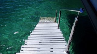 テラスのチェアで日光浴を堪能したので、そのままシュノーケリングすることに。 こんな風に、直接海に入れる階段がありました。 すでにプカ...