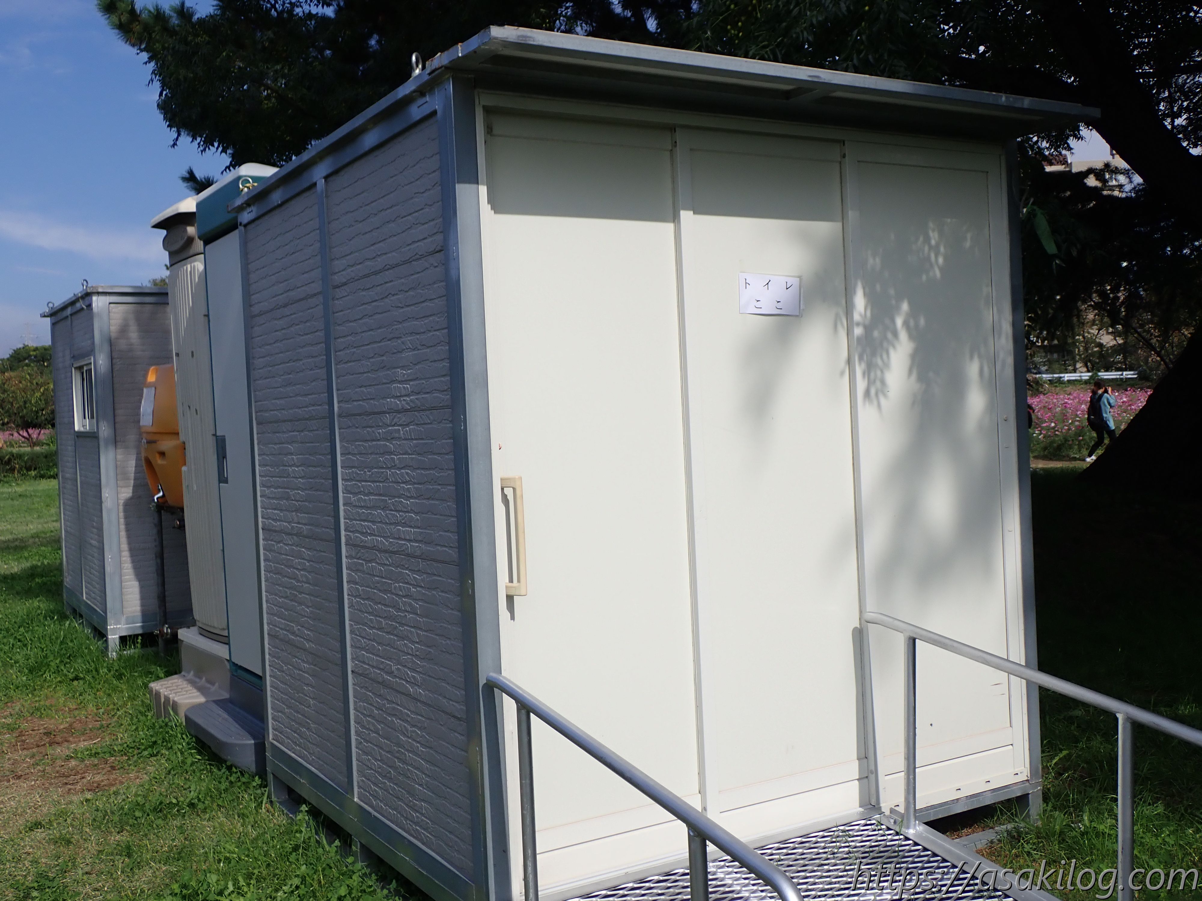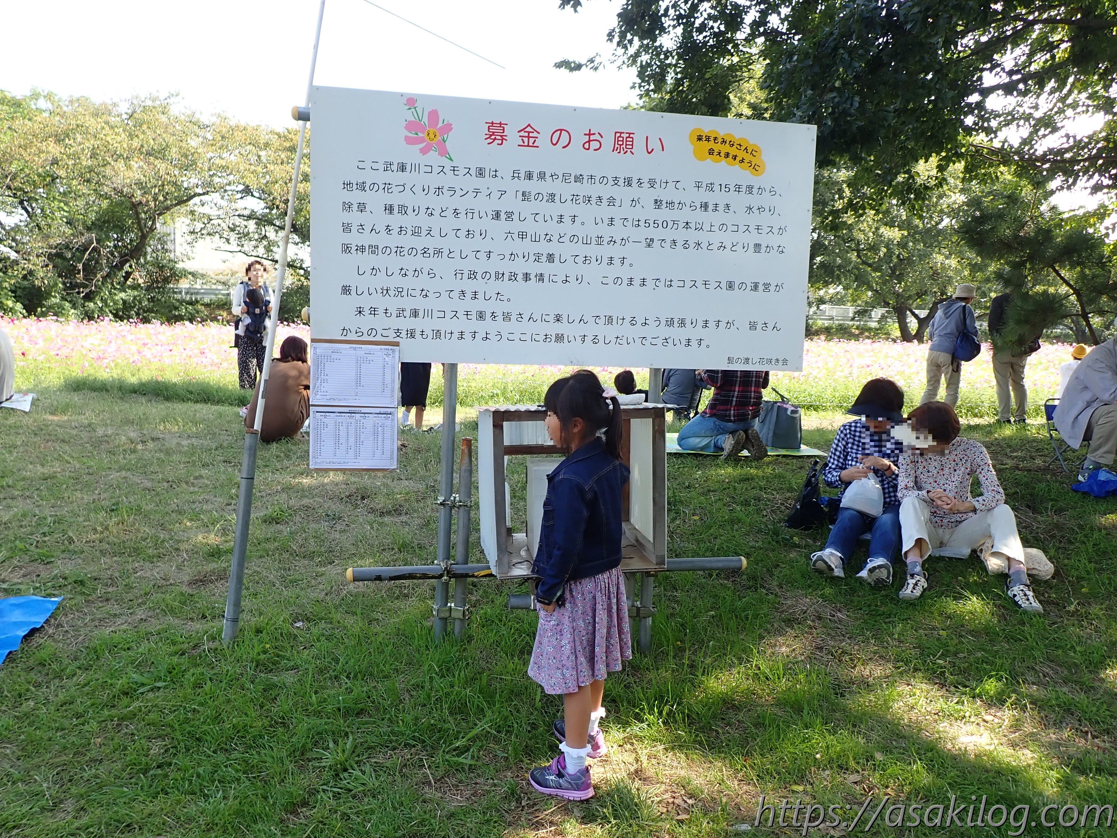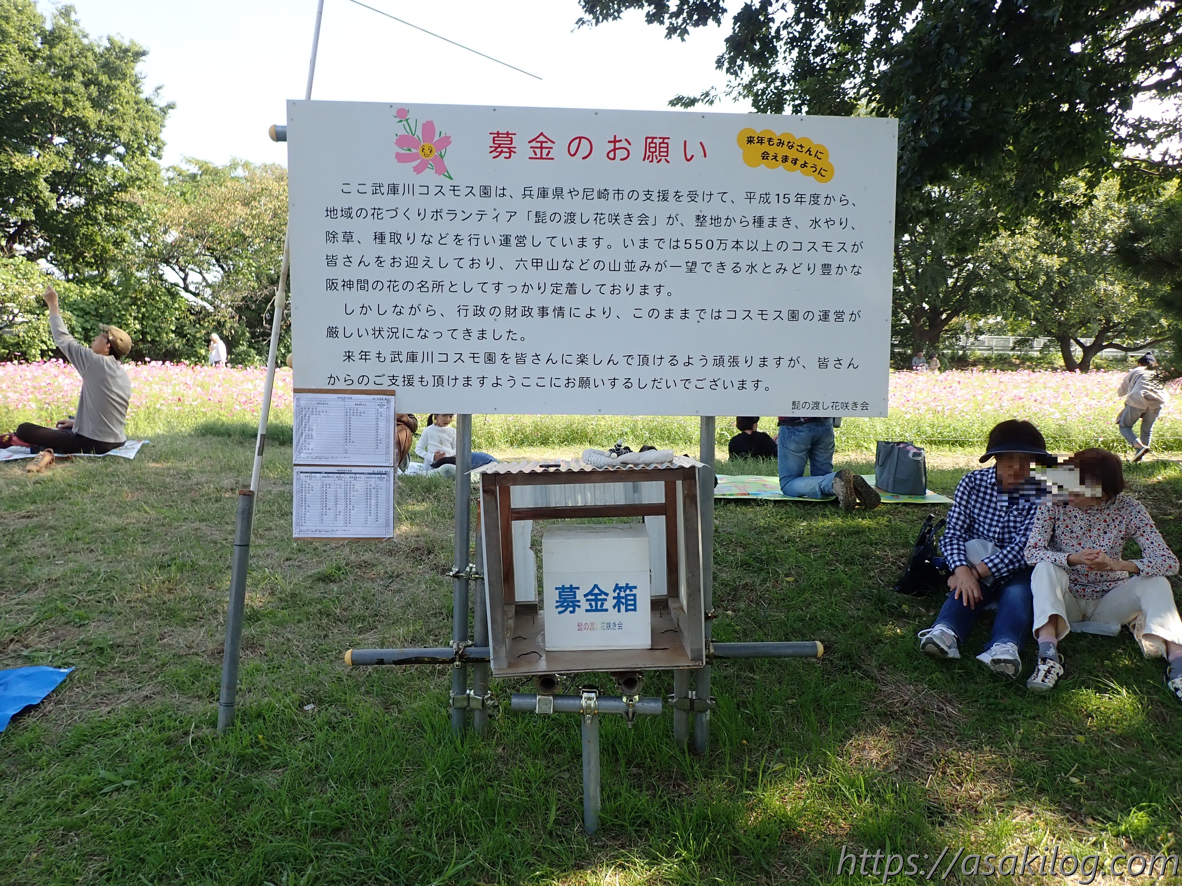 武庫川髭の渡しコスモス園には、トイレや募金箱も設置されています。