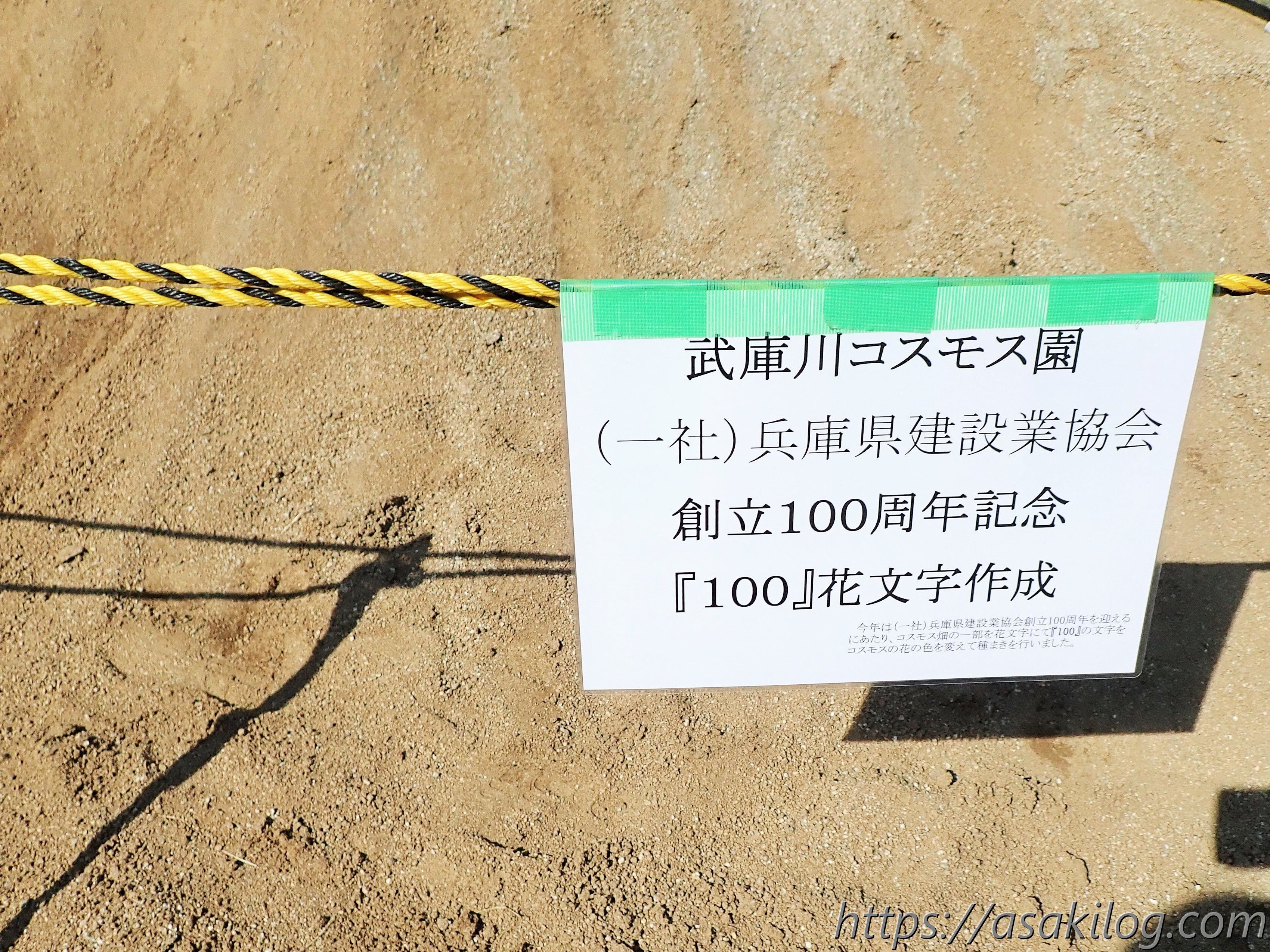 近づいてみると、こんな看板が。どうやらコスモスで「100花文字」を仕込んでいるよう。試しに小山を登ってみましたが・・・