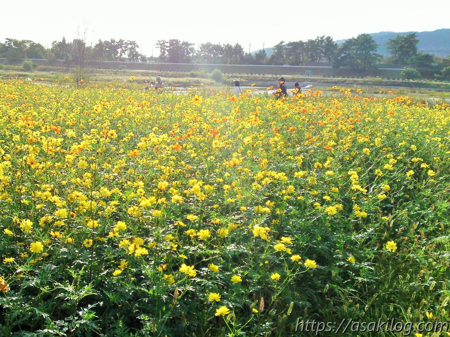 この年のキバナコスモスは、ちょっとレモン色?! 奥にあるのが武庫川です。