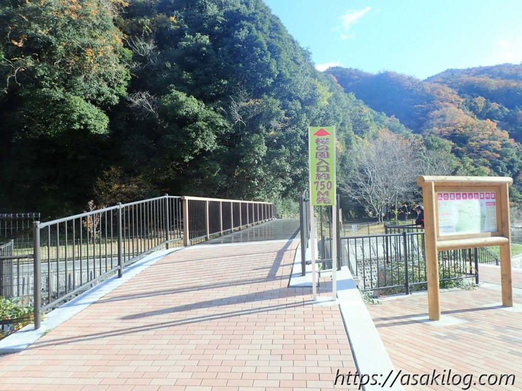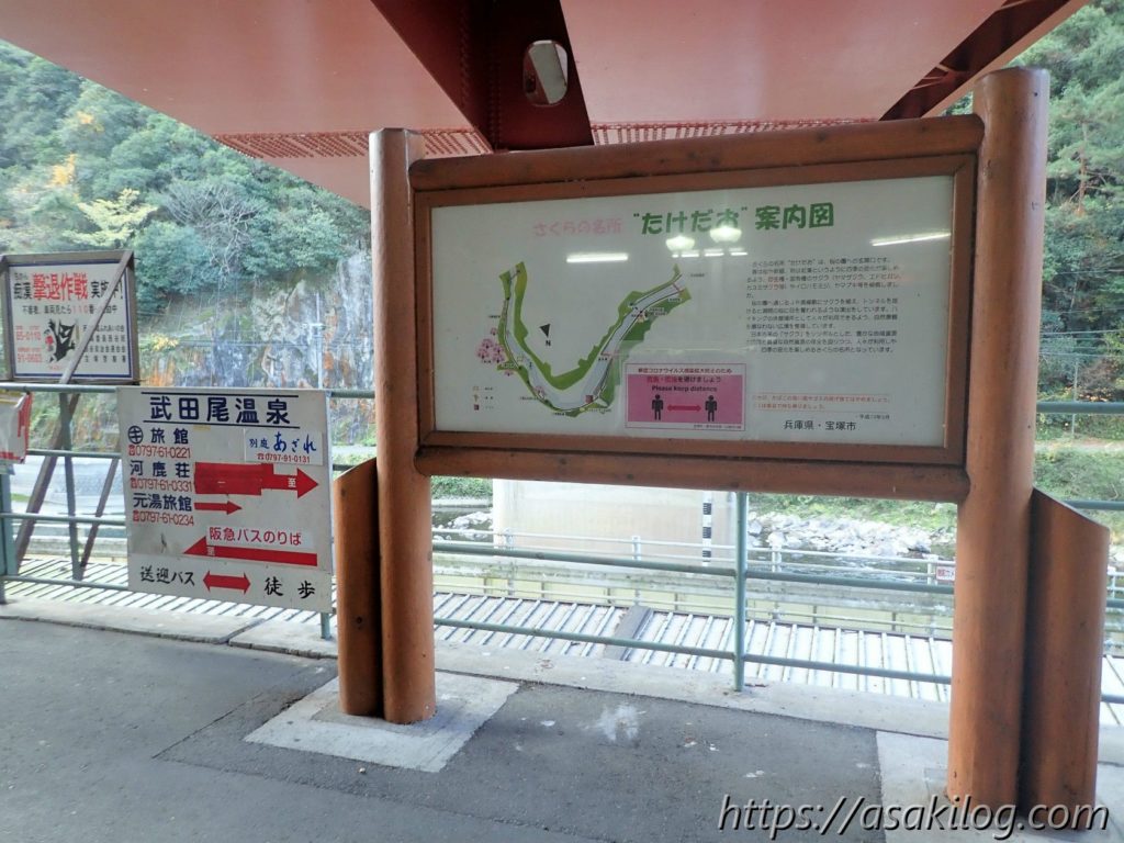 武田尾駅を振り返ってみると、電車がゴーッ!という音を立てながら、トンネルに入っていく姿が見えました。川を右側に見ながら進んでいき、途中で「武田尾温泉」の看板がありますが、今回この橋は渡りません。