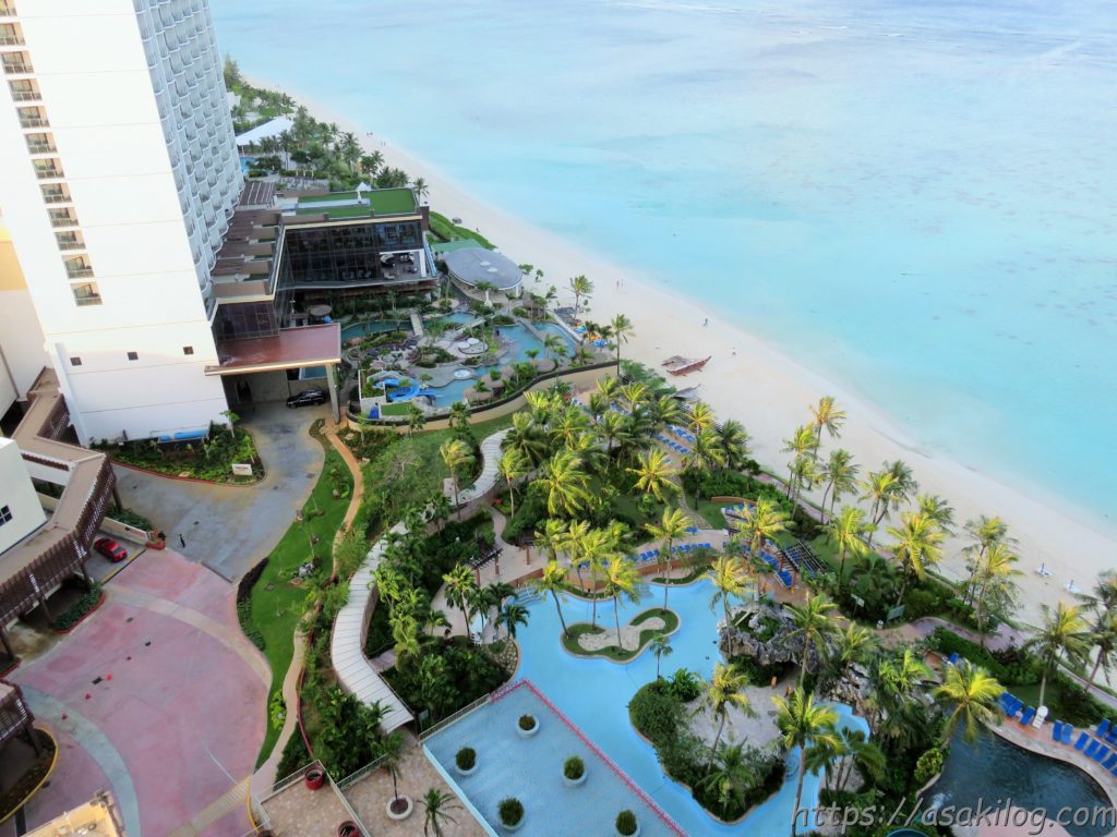 この写真はプールへ向かう前に、ホテルの部屋から撮影したものです。実は私が滞在した時は、プールの半分が工事の真っただ中・・残り半分しか使えませんでした(チェックインした際、部屋にsorryのお手紙あり) ヤシの木がいっぱいある水色部分のプールが工事中で、右下の濃い青のプールが営業中でした。
