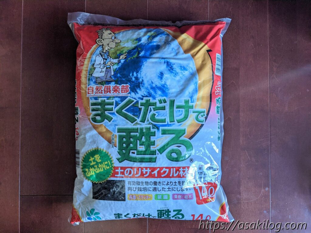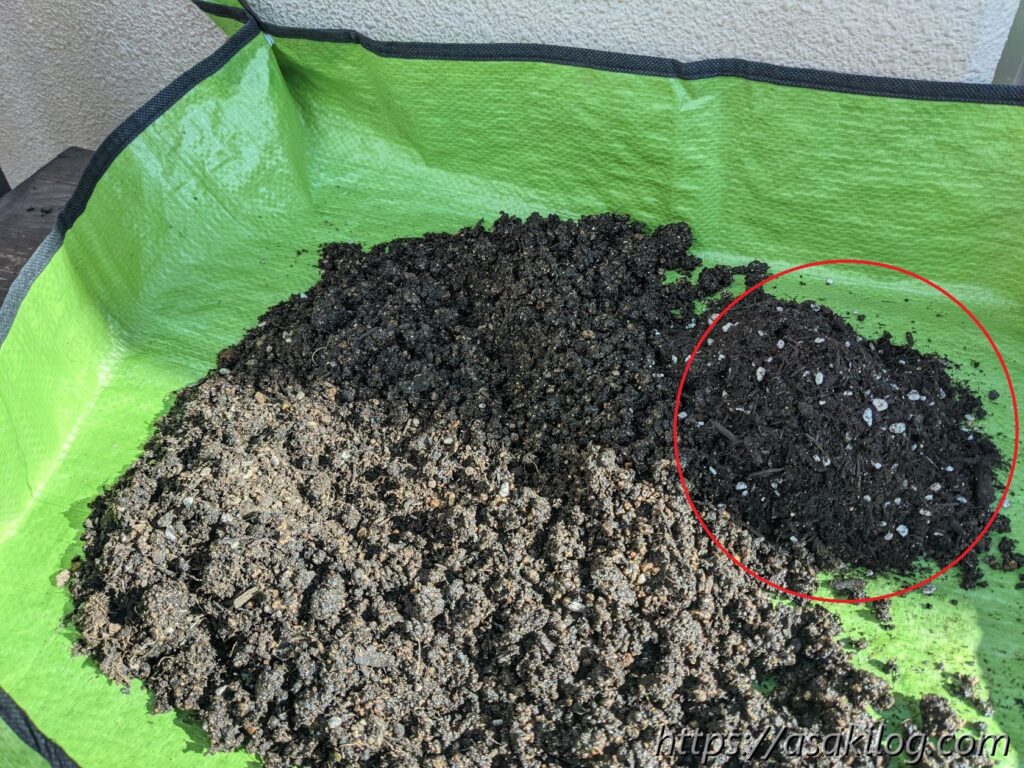 家にあった古い土に「自然応用科学 まくだけで甦る 土のリサイクル材 14L」を混ぜて使いました。土のリサイクル材は、右側写真の赤丸部分。古い土に対して1割程度混ぜて使います。野菜とお花の両方に使えるのが便利ですよ。ただし重たいので、私は基本的にamazonで購入しています。