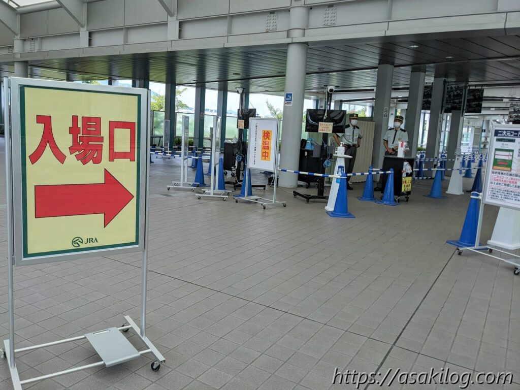 駐車場の階段を登り阪神競馬場へ向かうと、左の写真のような「入場口」の看板が見えてきます。その後右の写真の「一般入場」へ向かうと、競馬場の中に入れます。なおこの日はパークウィンズ時で入場料無料だったため、入場券の購入は不要でした。