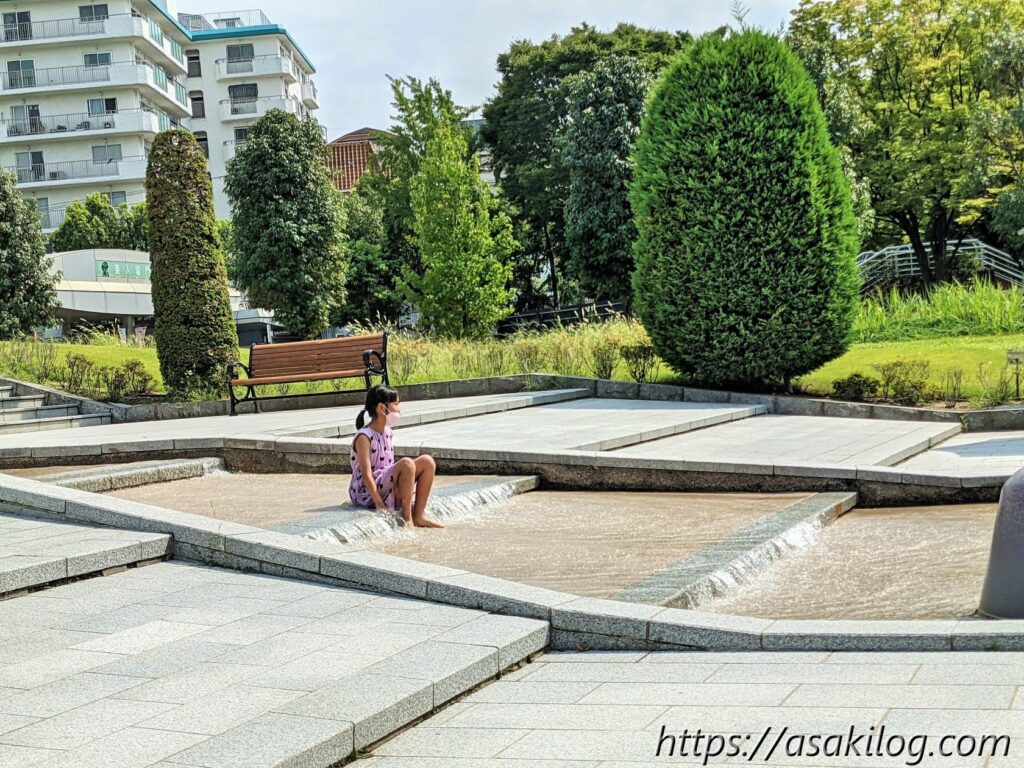 噴水広場の奥には、(水遊びはできませんが)小さな噴水や、浅い川ゾーンで遊ぶこともできます。私はベンチに座って娘を見守りつつ、のんびりと過ごしました。