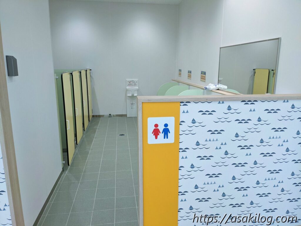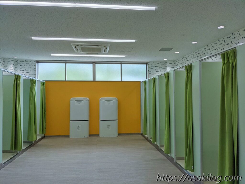 キッズ更衣室の入口は、インフォメーションの左側。中に入ると写真のような感じで、安心して着替えさせることができます。また子ども専用トイレもあり、子ども連れにはありがたい施設でした。