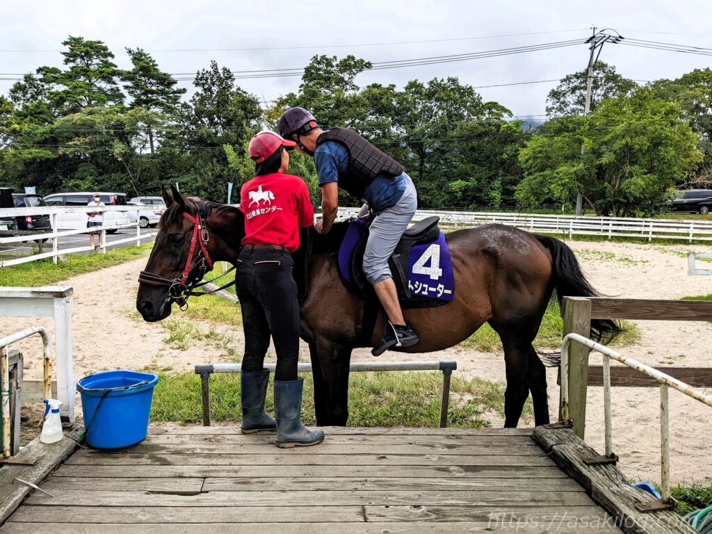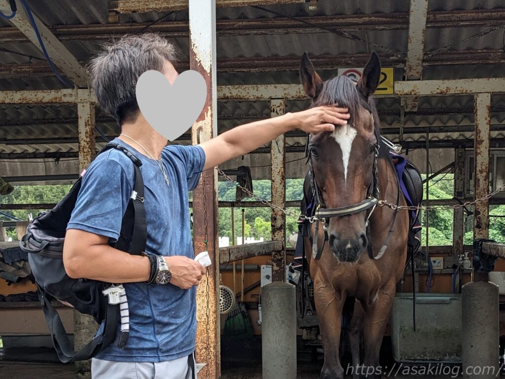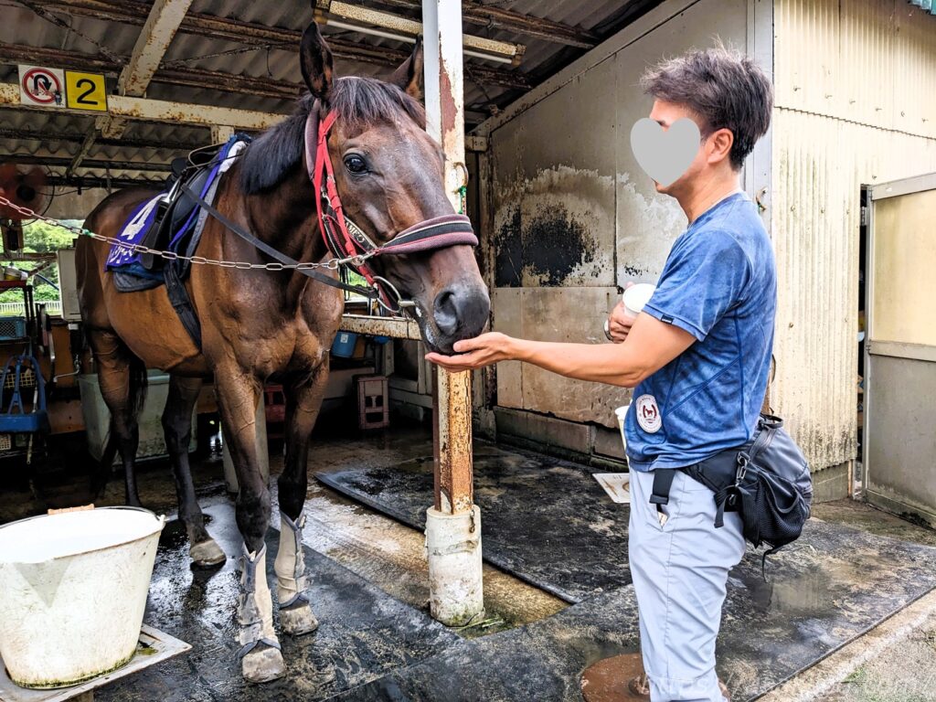 今回乗せてもらったのは「ハートシューター」、2006年生まれ・17歳の高齢のお馬さんです。競馬好きの夫曰く2009年~2011年中央競馬で1000万クラスまで活躍していたそう。