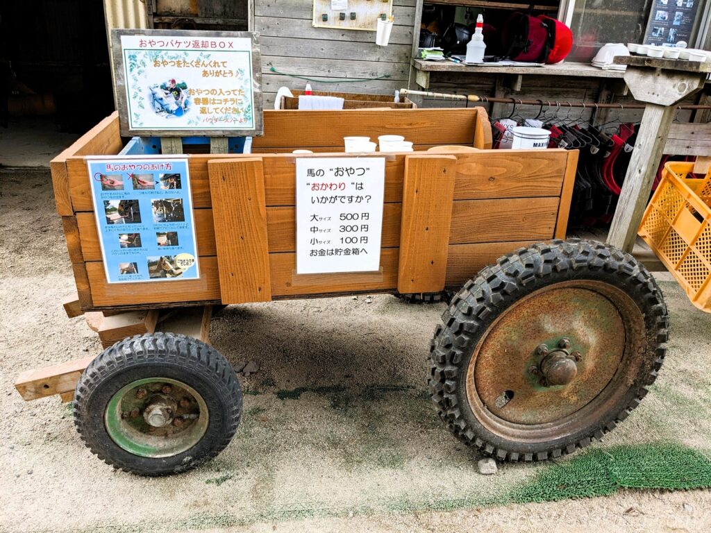 大山乗馬センターの入場料には、馬のおやつ代も含まれています。このコーナーでおやつを受け取り、手の平またはバケツに入れてあげましょう。(おかわりは別料金)