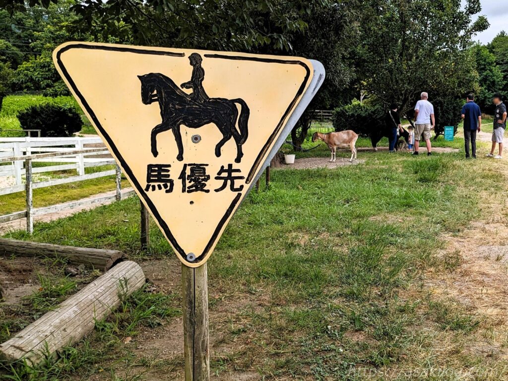 こちらの写真は、大山乗馬センター内のもの。「馬優先」っていうのが良き。
