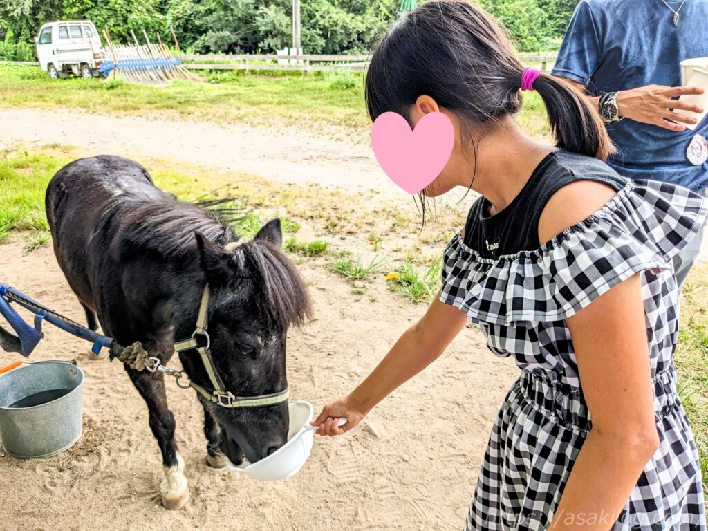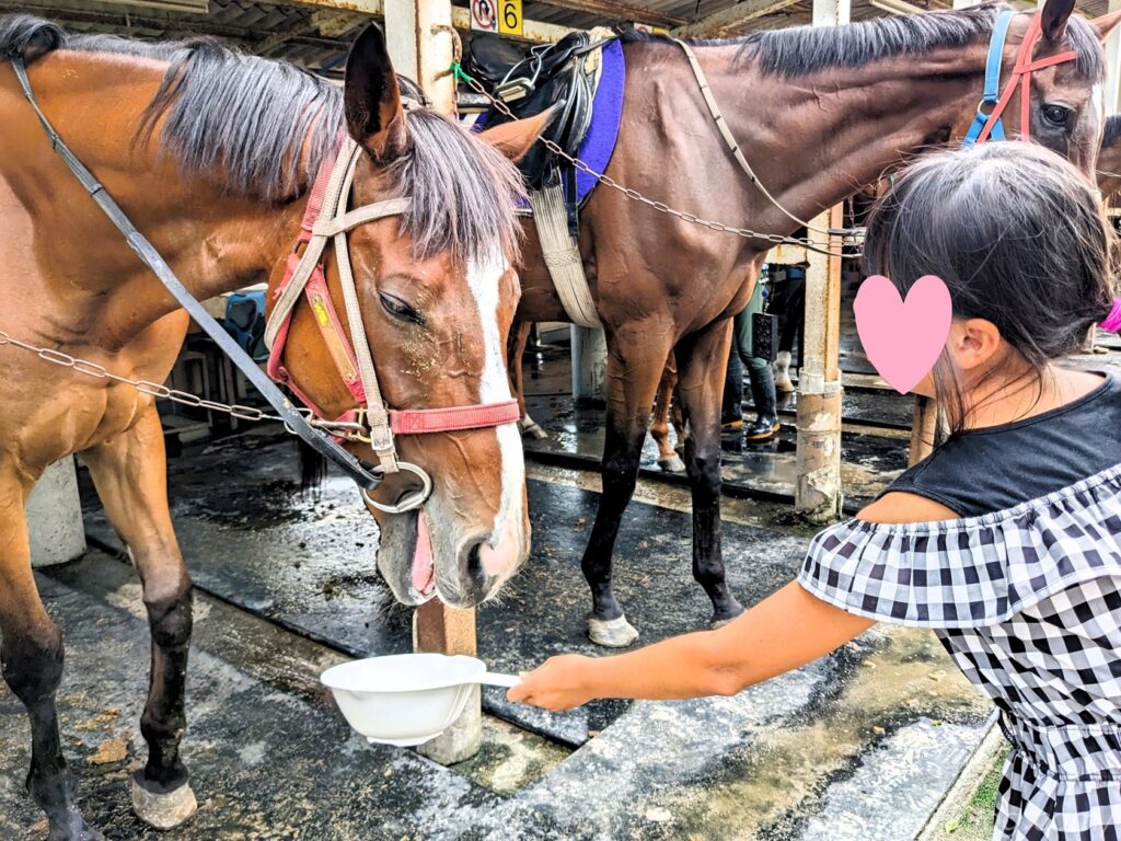 こちらは実際にお馬さんにおやつをあげている写真です。手の平から余裕で食べさせてあげる夫と、腰が引けるほどビビりつつバケツからあげる娘(笑)。
