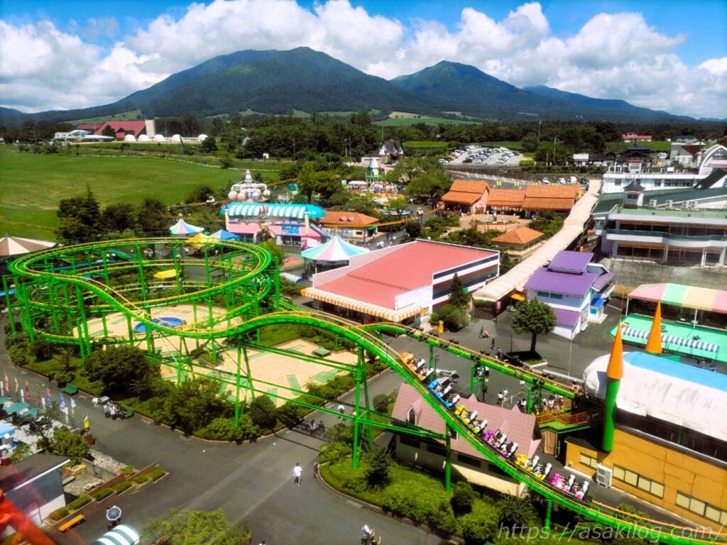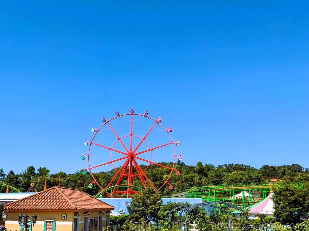 一番右側の景色写真は夫が撮影したもので、遊園地の景色と大自然のパノラマを一望。夫曰く、乗る時に団扇を渡され、観覧車では意外と風が涼しかったため、エアコン無しでも大丈夫だったそうです。