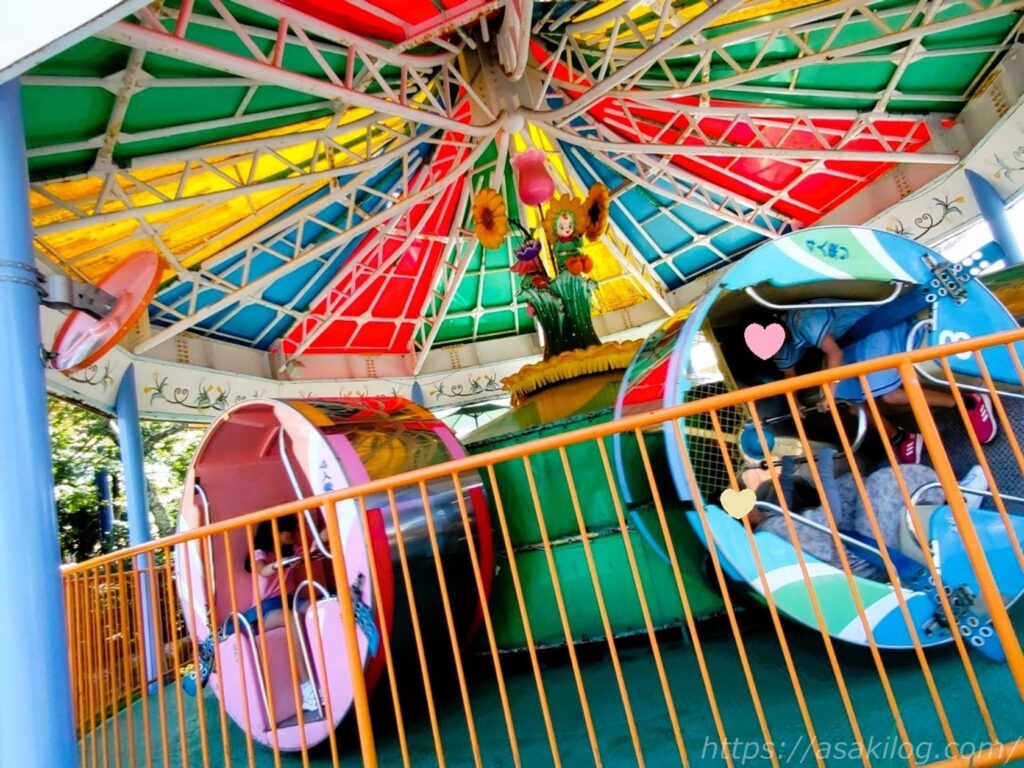 私が想像していたよりも、思わぬ方向にぐるぐる勢いよく回って気持ち悪かったり、お腹の支え棒が当たって痛かったり。娘と向かい合いながらギャーギャー大騒ぎ、かなりハードで疲労困憊しました。写真は夫君が撮影したものです。