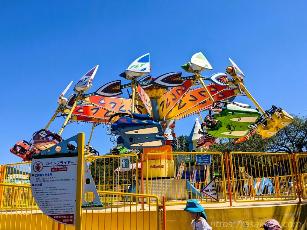 「カイトフライヤー」は、うつぶせの姿勢で4mの高さまで昇り、爽快に回転するアトラクション。娘と夫君の二人で乗りました。
