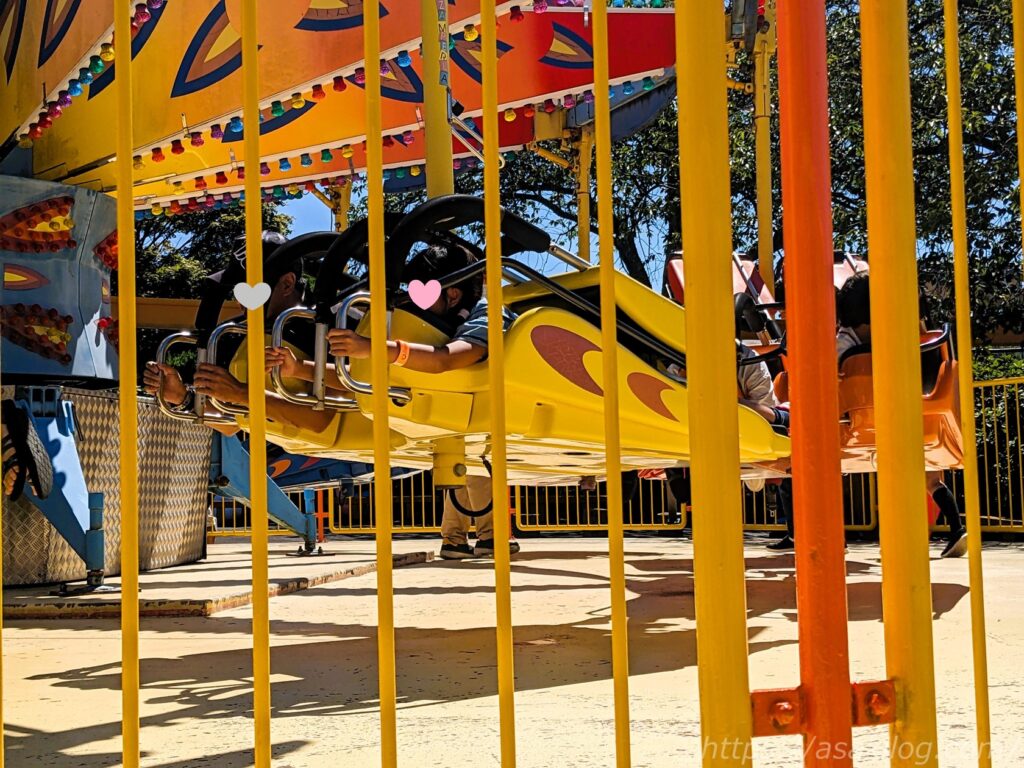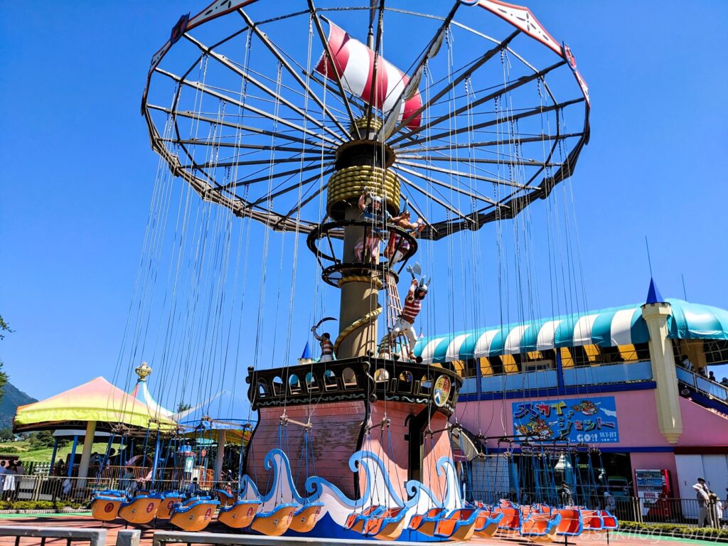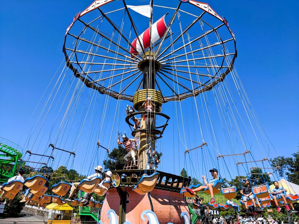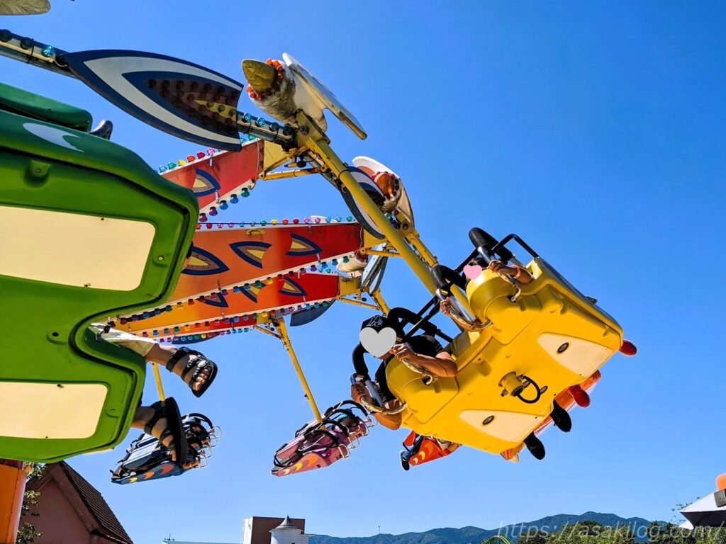 遊園地の定番・ブランコのアトラクション「ラウンドパイレート」。娘と夫君の二人で乗りました。