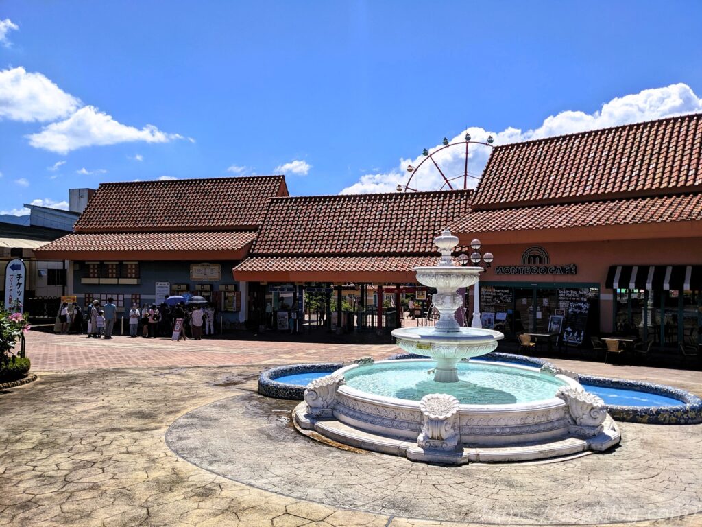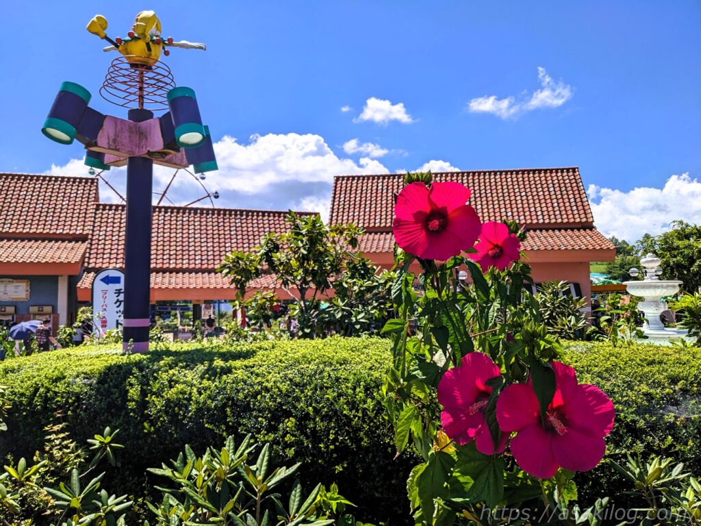 遊園地「ジョイフルパーク」は、ヒルゼン高原センターの隣に位置しています。噴水の奥に、チケット売り場とメインゲート(入口)があり、手前には夏らしい綺麗なハイビスカスが咲いてました。