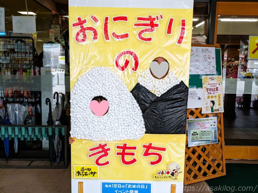 仕方なく、農産物等直売所「なかうみ菜彩館」で自宅用の野菜・果物だけ購入。夫と娘がなぜかおにぎりの顔出しパネルで写真を撮って、早々に撤収しました。