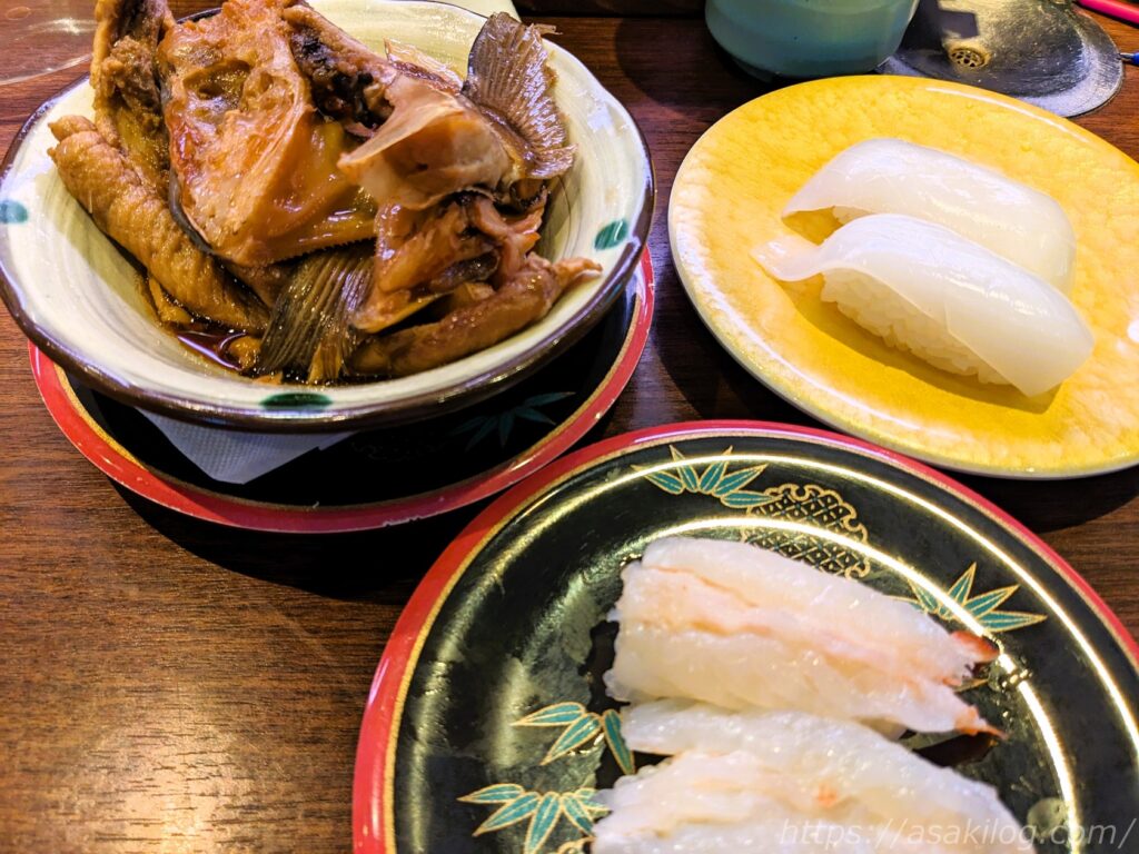 回転寿司でありながら、地魚の大ぶりのネタをたくさん堪能!お寿司はどれもこれも美味しかったのですが、個人的に感動したのが、写真左上の「あら炊き」です。しっかりと味がしみ込んだ一品でボリュームもあり!ほっこりする味わいに大変癒されました。
