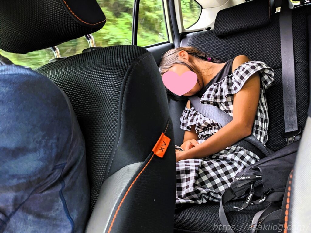こちらの写真は、帰り道の車の中で疲れ果てて寝てしまった娘です。