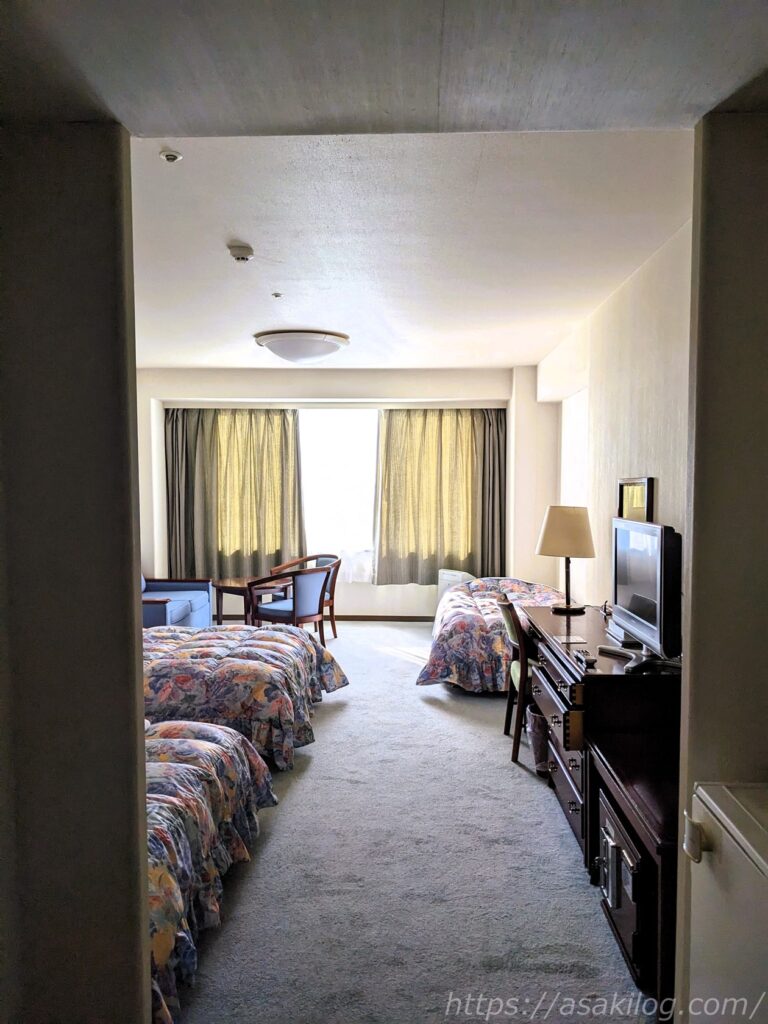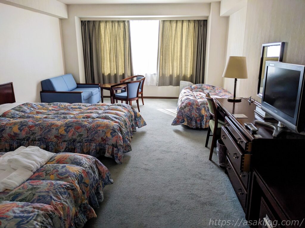 36㎡の広々とした清潔感のあるお部屋。今回娘のためにエキストラベッド(窓側)を入れてもらいました。