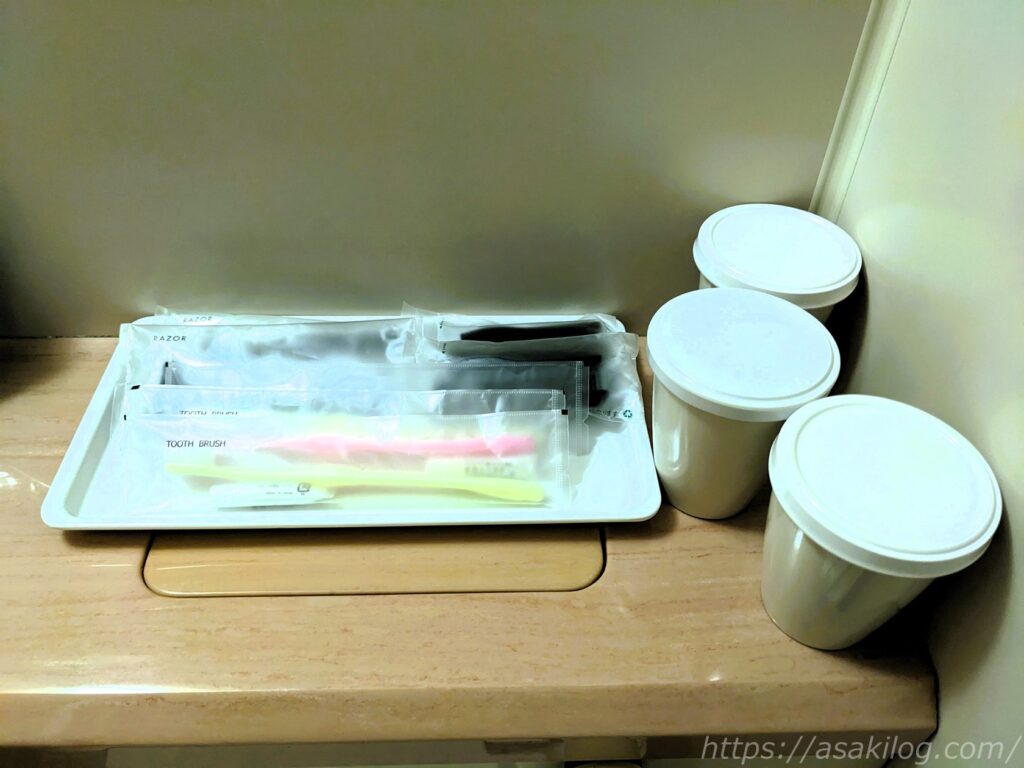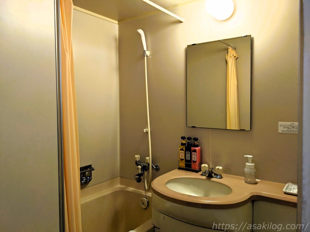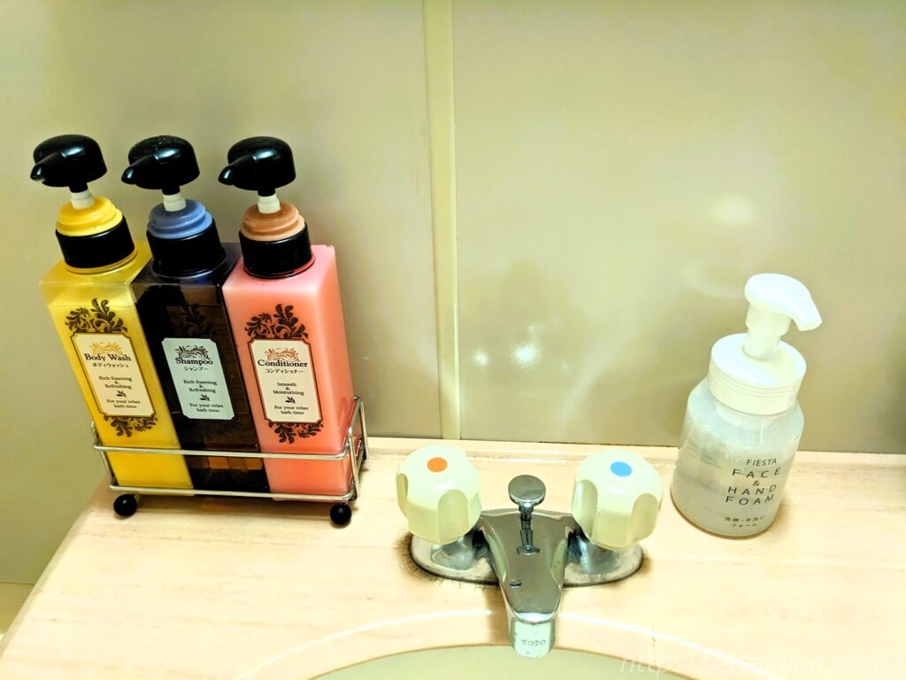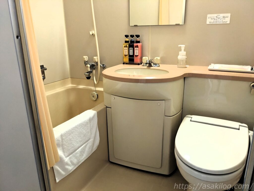 バスルームは、洗面台・トイレ・お風呂が備わったユニットバス。アメニティは洗面台にまとめて置いてありました。