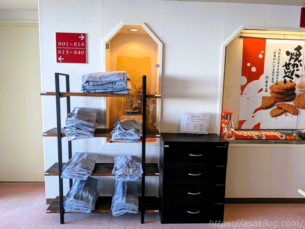 各階のエレベータホールには浴衣が置いてあるコーナーがあり、自分のサイズに合ったものを選んで客室に持っていくスタイルです。