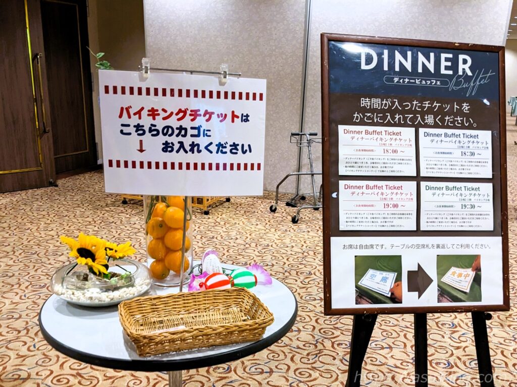 まずはディナービュッフェ。入口にはチケットを入れるカゴがあるだけでした。