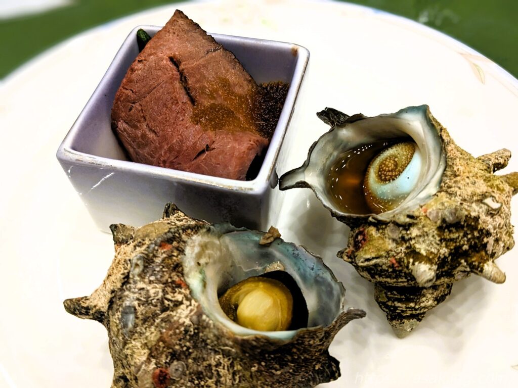 お好みの食材を濃厚クリーミーな「チーズフォンデュ」で、香ばしい味わいの「ローストビーフ」、珍しい「サザエのつぼ焼き」など。品数がかなり豊富で、どれを食べようか?悩みながら、少しずつ選びました。