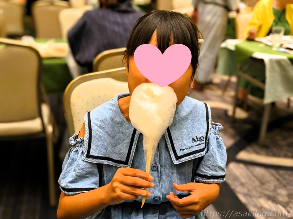デザートはフルーツやドーナツ・ケーキ、そして自分で作る綿菓子まであって、娘も大満足。