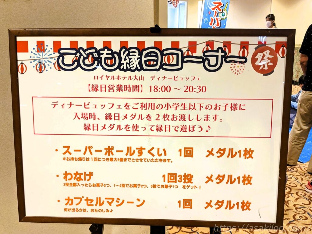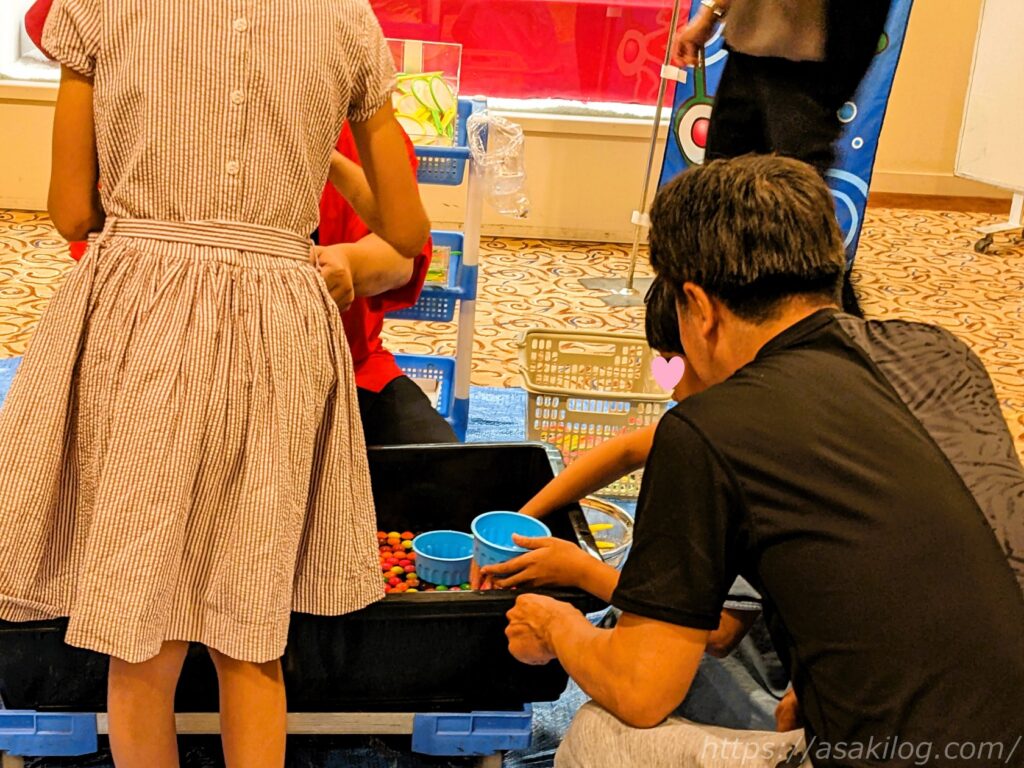 ディナービュッフェでお腹がいっぱいになった後は、出口の「こども縁日コーナー」を楽しみました。スーパーボールをゲット。