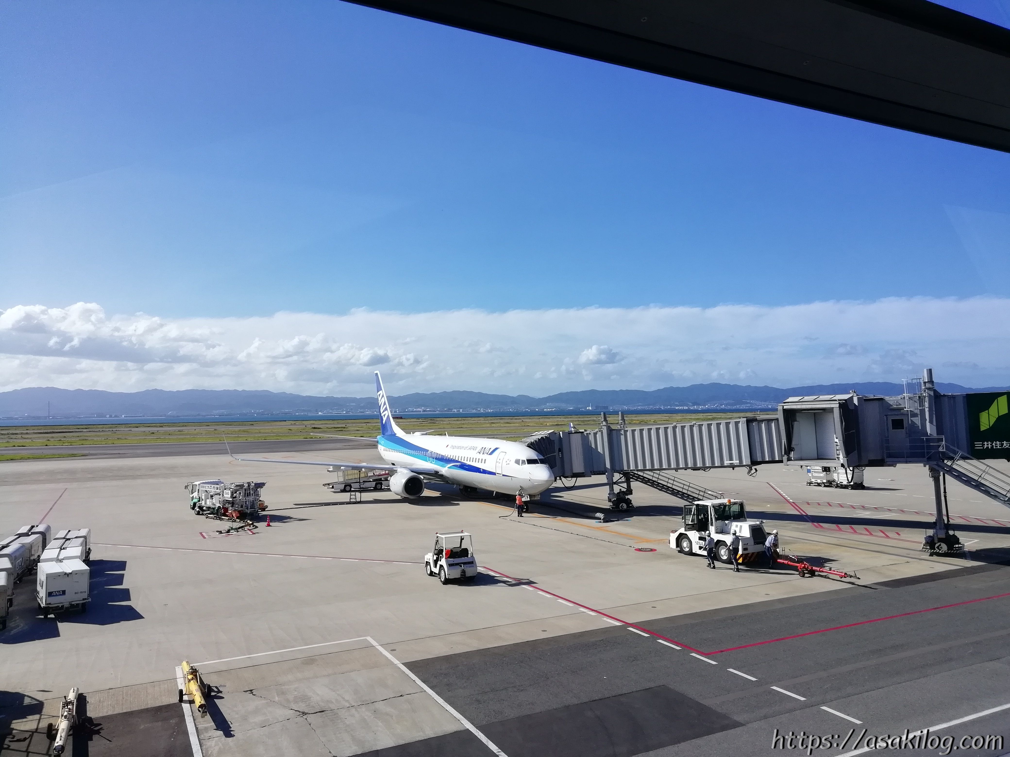 今回搭乗する飛行機はこちら、ANA1747便です。この日の大阪は快晴!青空が眩しい~。