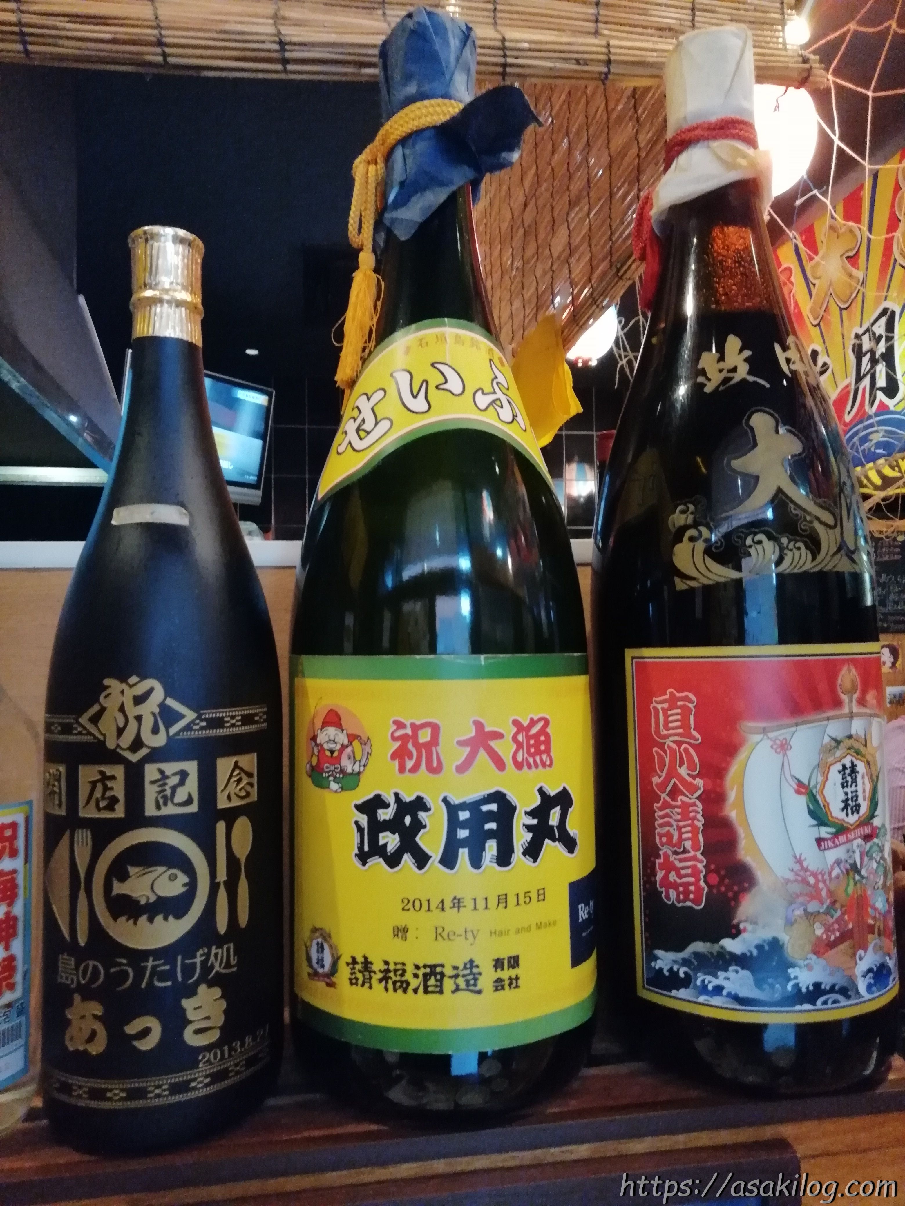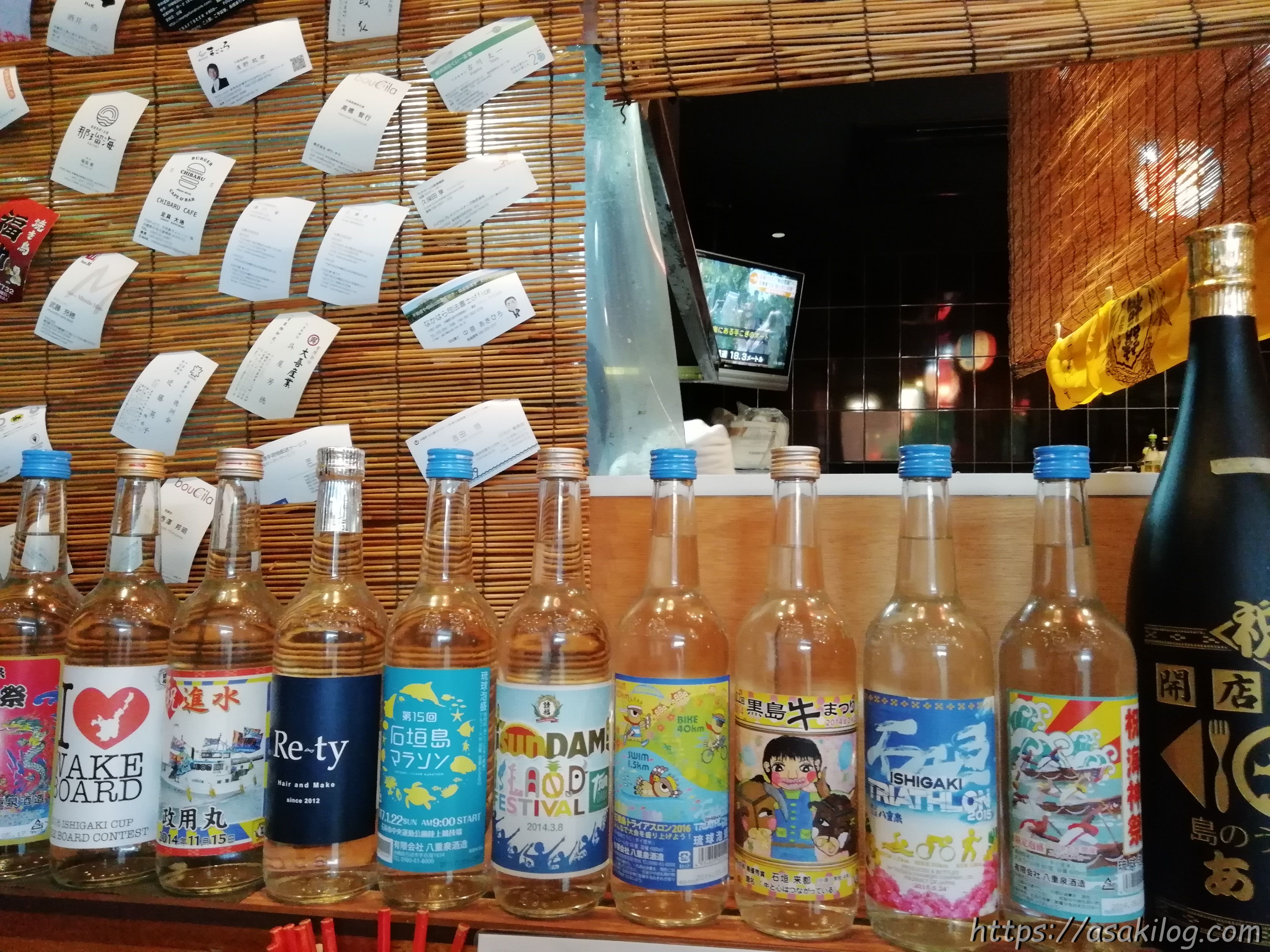 ちなみにあっきの店内の様子ですが、カウンター席には、泡盛がずらっと並び・・・