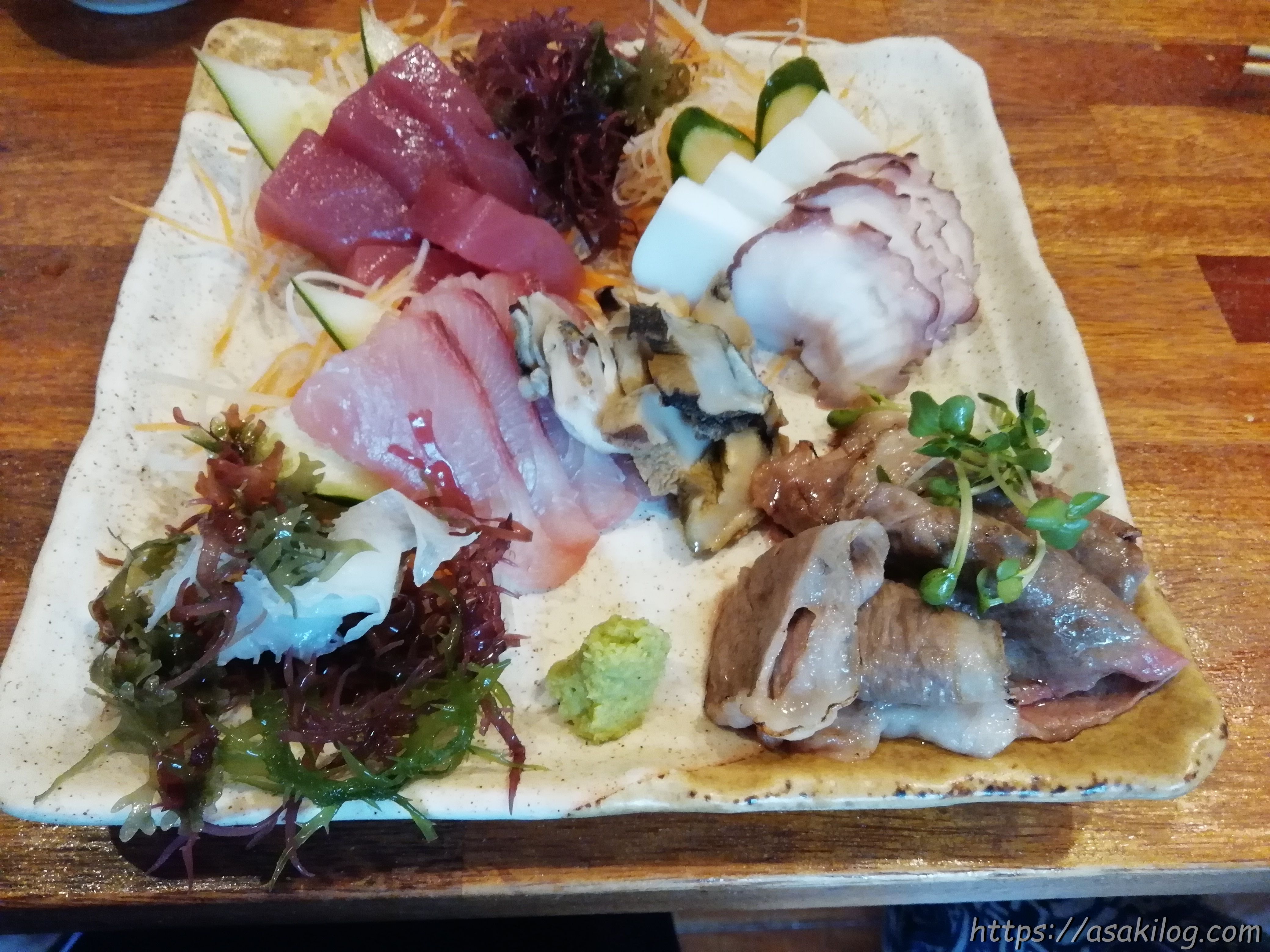 「石垣牛炙り&近海刺身の盛合せ」をオーダー。石垣牛は柔らかくって口当たり良し!近海刺身の盛合せはとっても新鮮で美味~。