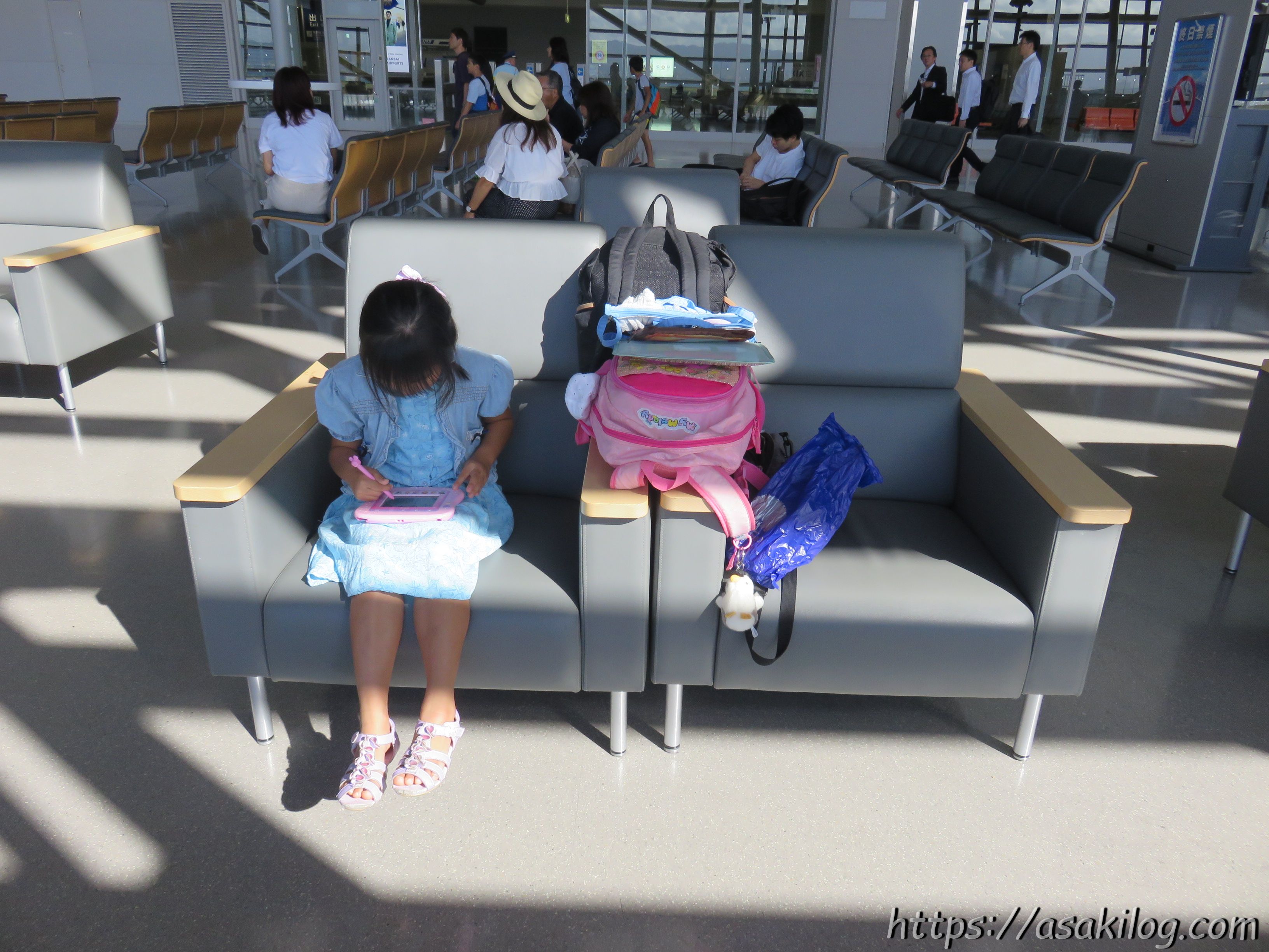 搭乗開始まで時間に余裕がありました。マイペースにゲームで暇つぶしをする娘・・さすが6歳にもなると、リュックに入れて持ってきたオモチャで勝手に遊んで待っててくれて助かります