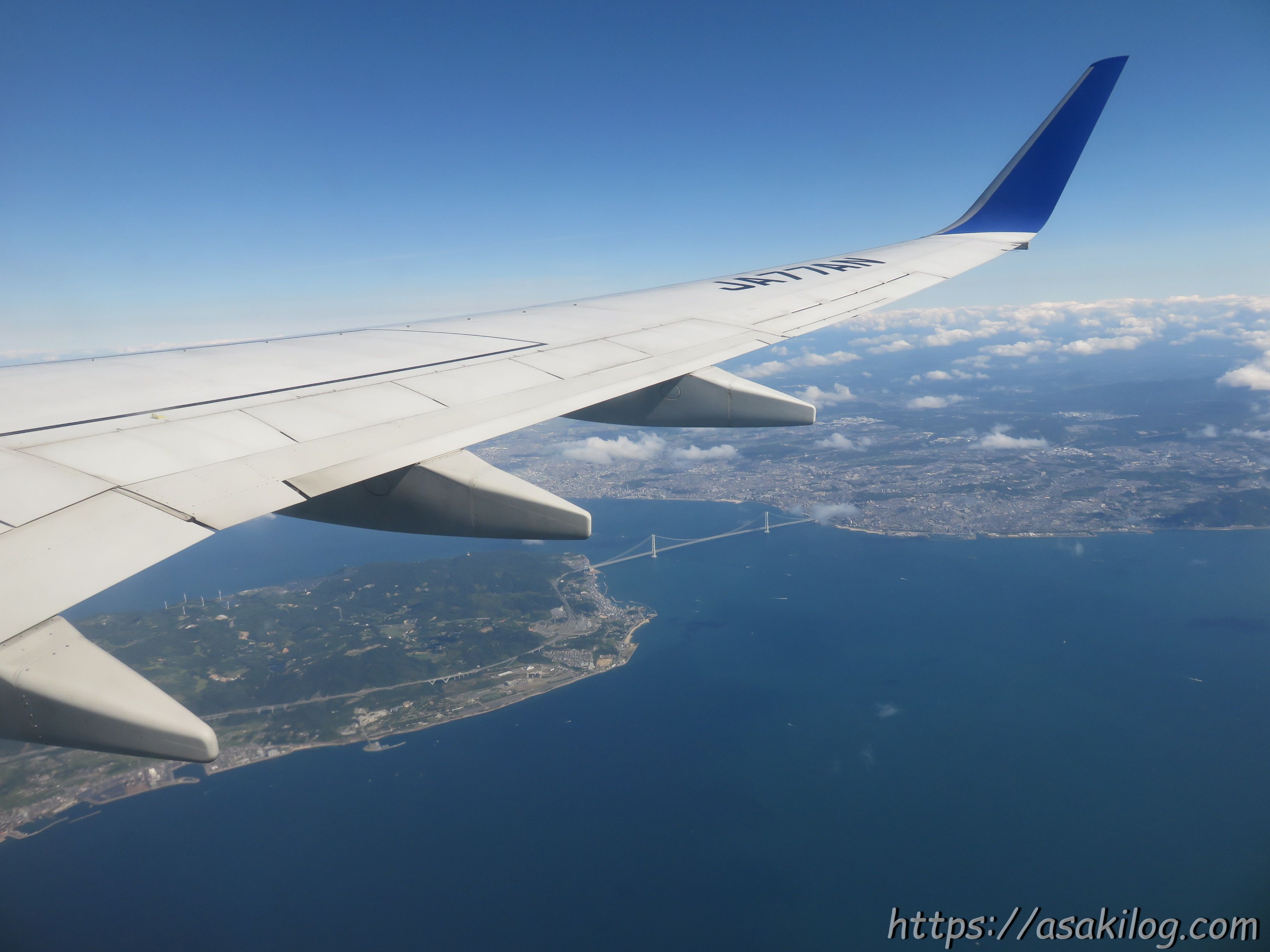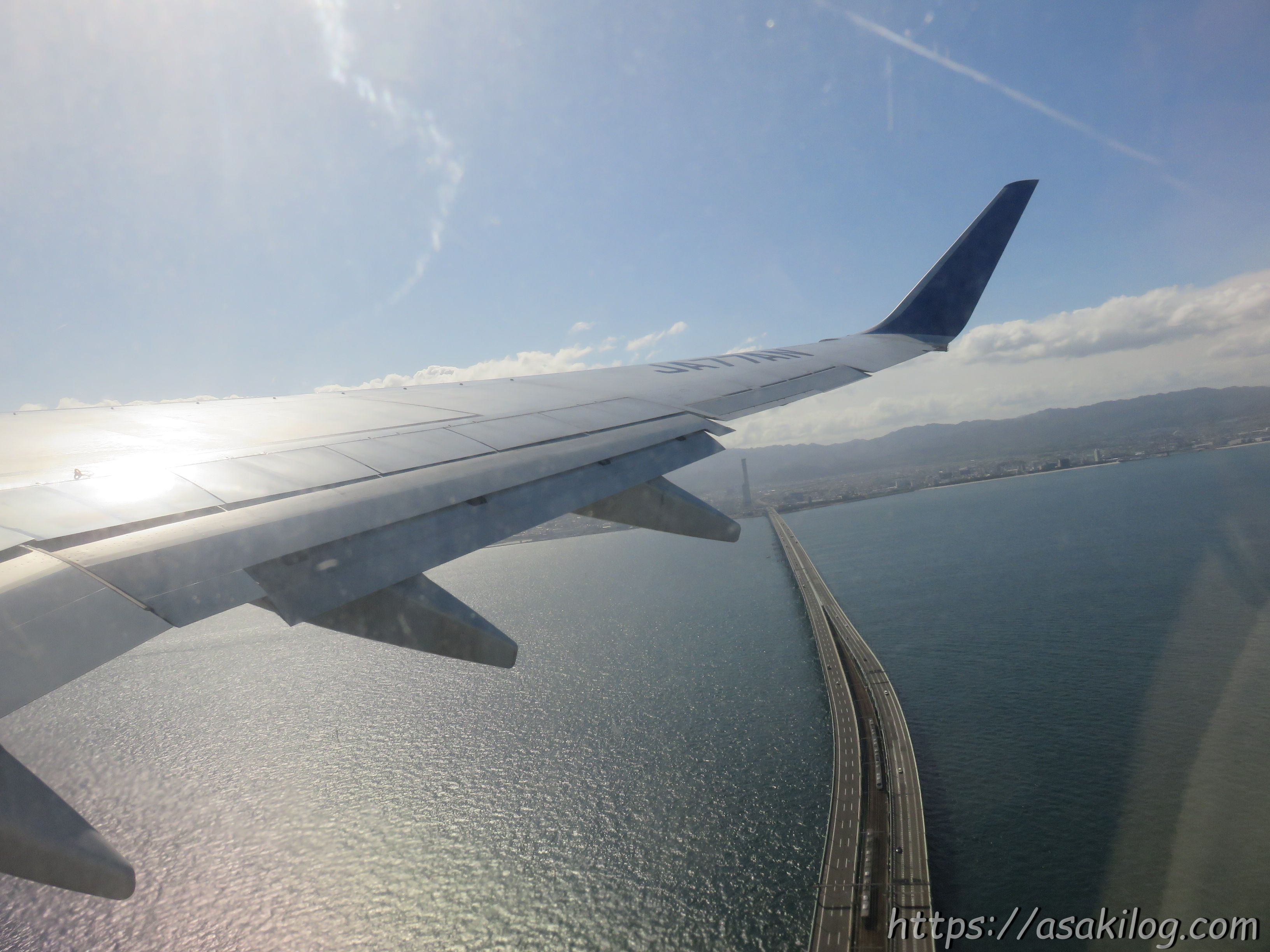 いよいよ関西国際空港を出発!下に見えるのは、先ほどバスで通った「関西国際空港連絡橋」。大阪のりんくうタウン~空港間を結んでいます。
