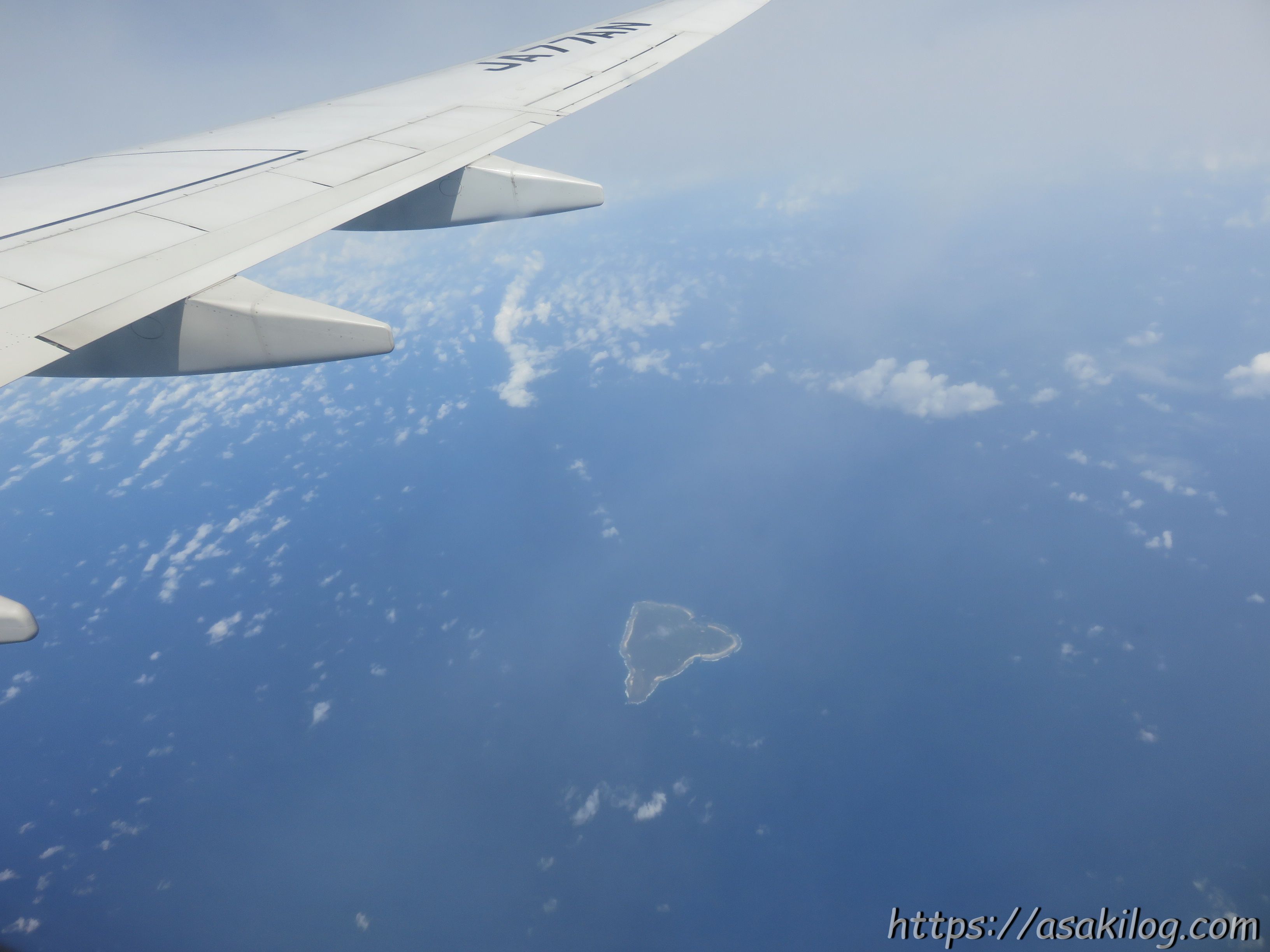 関西国際空港から1時間ほどで、ハート型の島が見えました。機内アナウンスによると、鹿児島県にある「宝島」なんだそう。確かにハート形に見えなくもない~?!