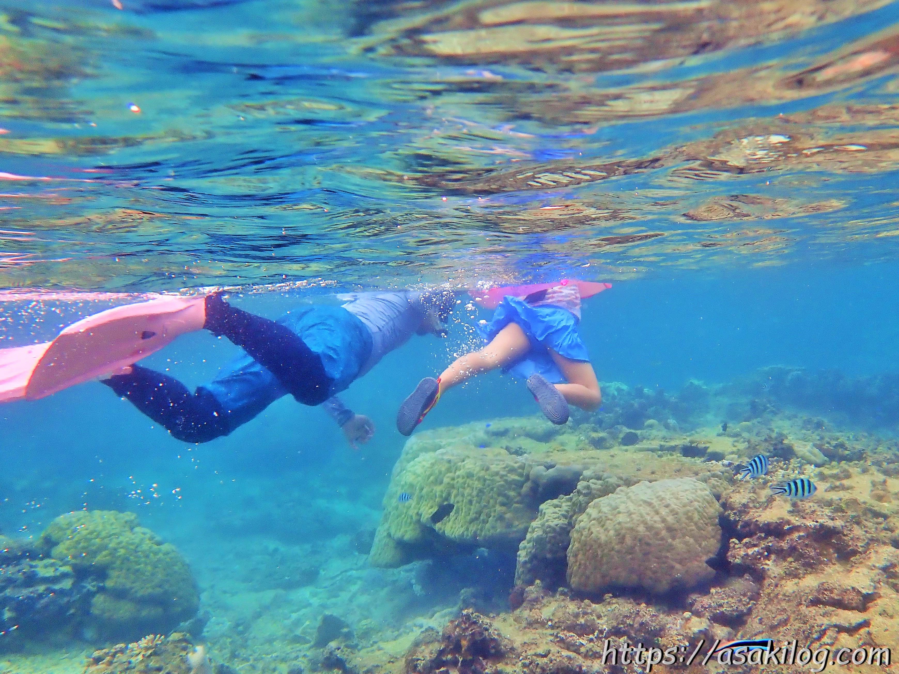 たくさんのスズメダイが泳いでいるのを見つけ、シュノーケルをくわえながら「声にならない歓喜の声」をあげる娘(笑)。まだシュノーケリングを覚えたばかりなので、水面を見るのに必死な様子でした。