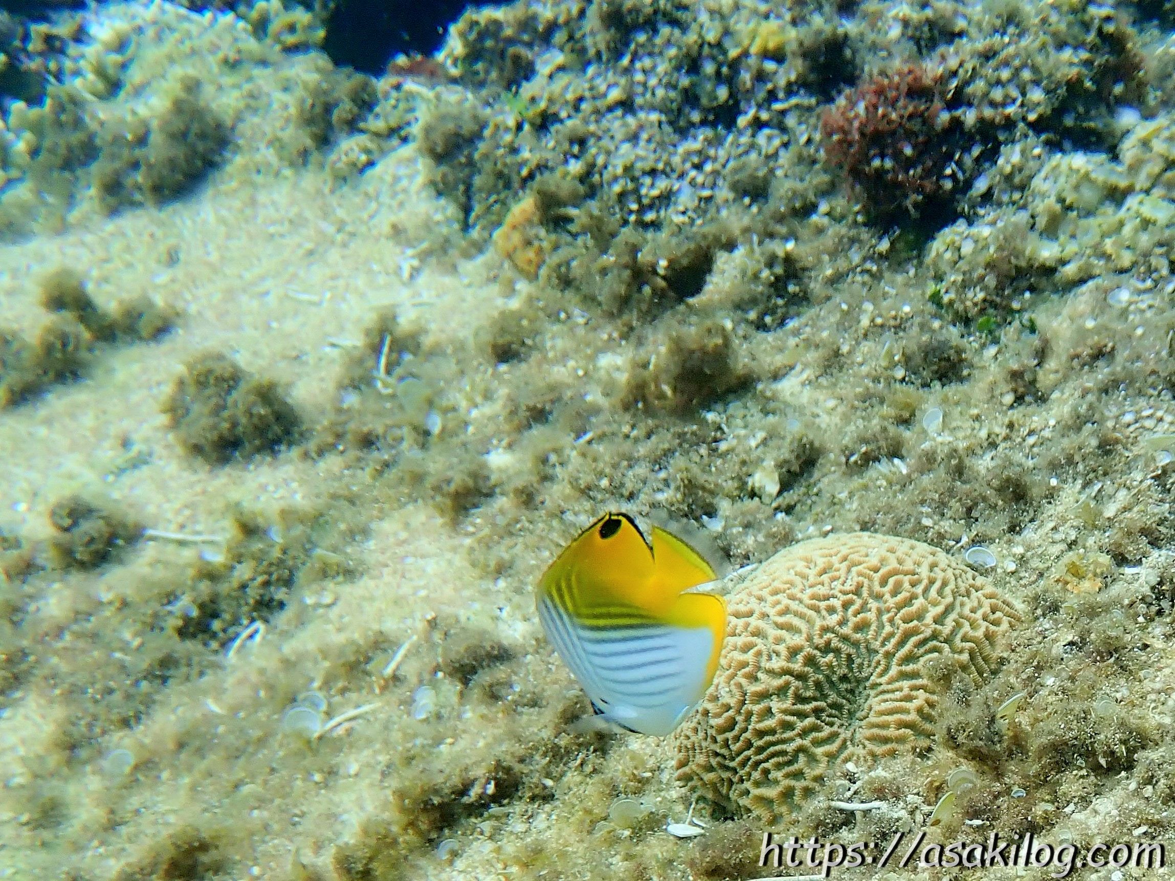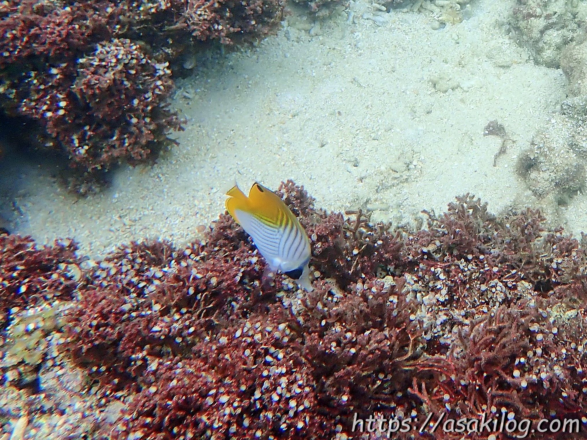 こちらの黄色と白のお魚は、トゲチョウチョウウオ。