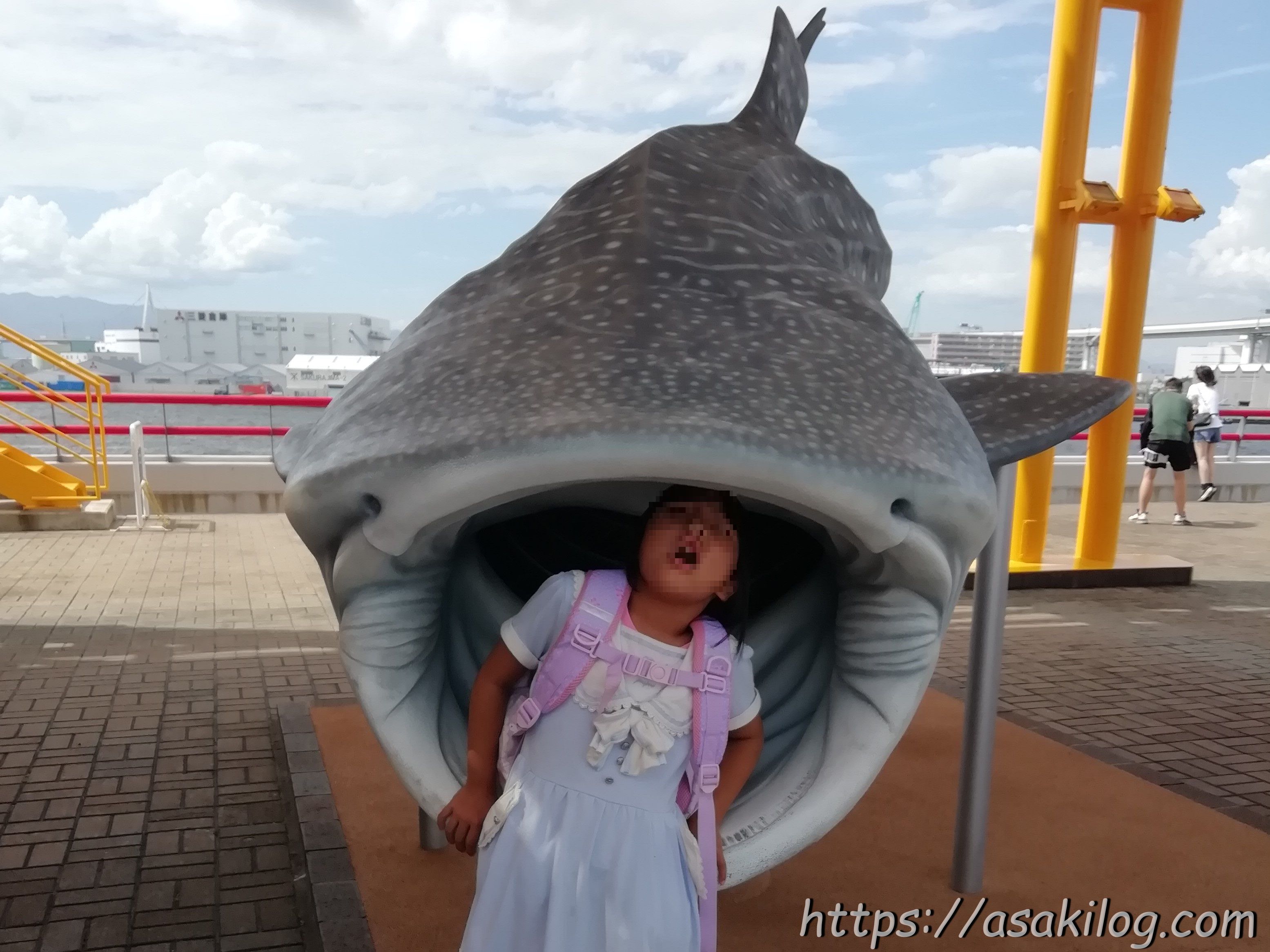 この写真は、海遊館入口で、偽物のジンベエザメに食べられてはしゃぐ娘です・・。