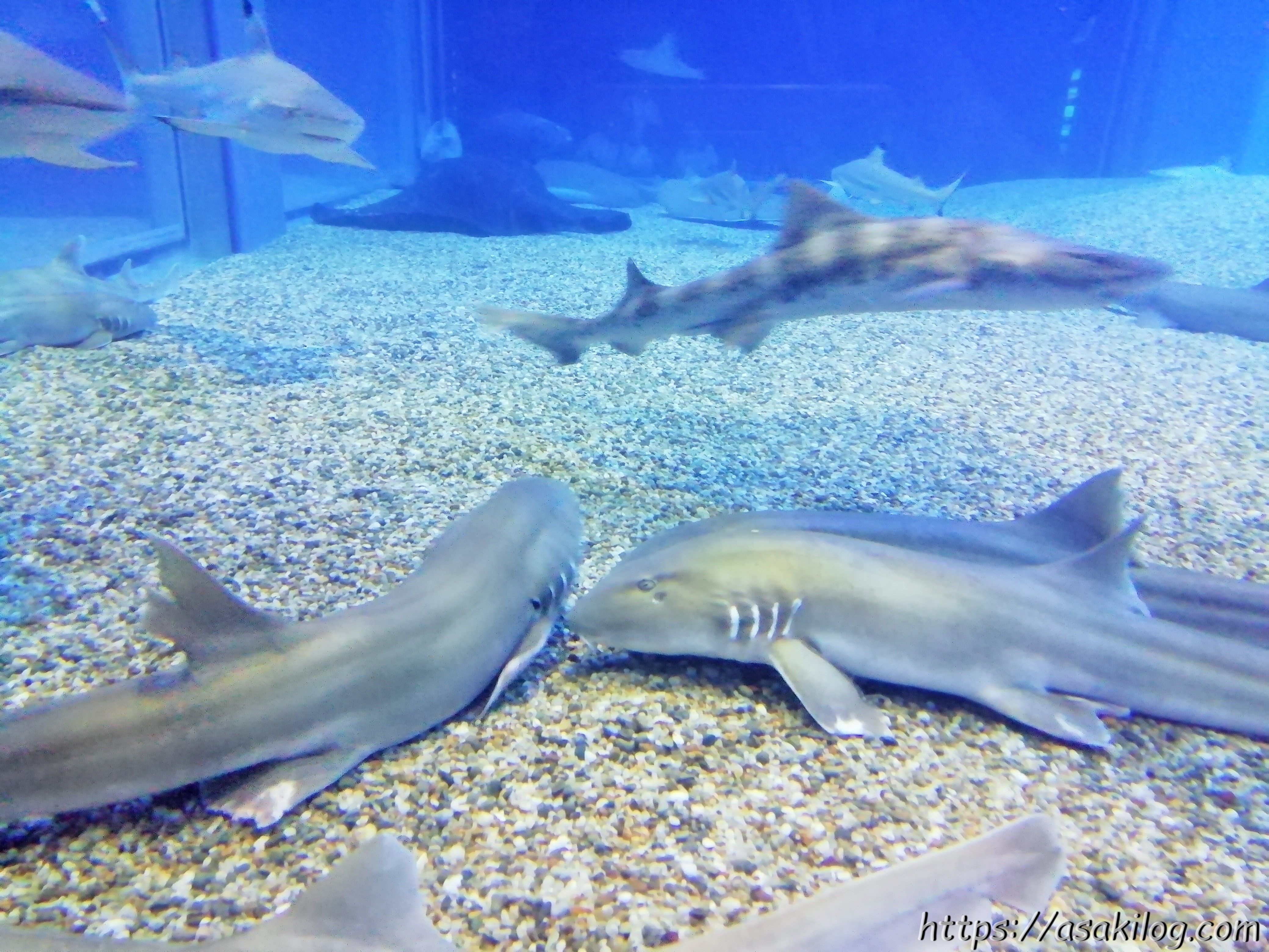 手前に仲良く並んでいるのは、イヌザメ。水槽の下の方で、じーっとしていました。